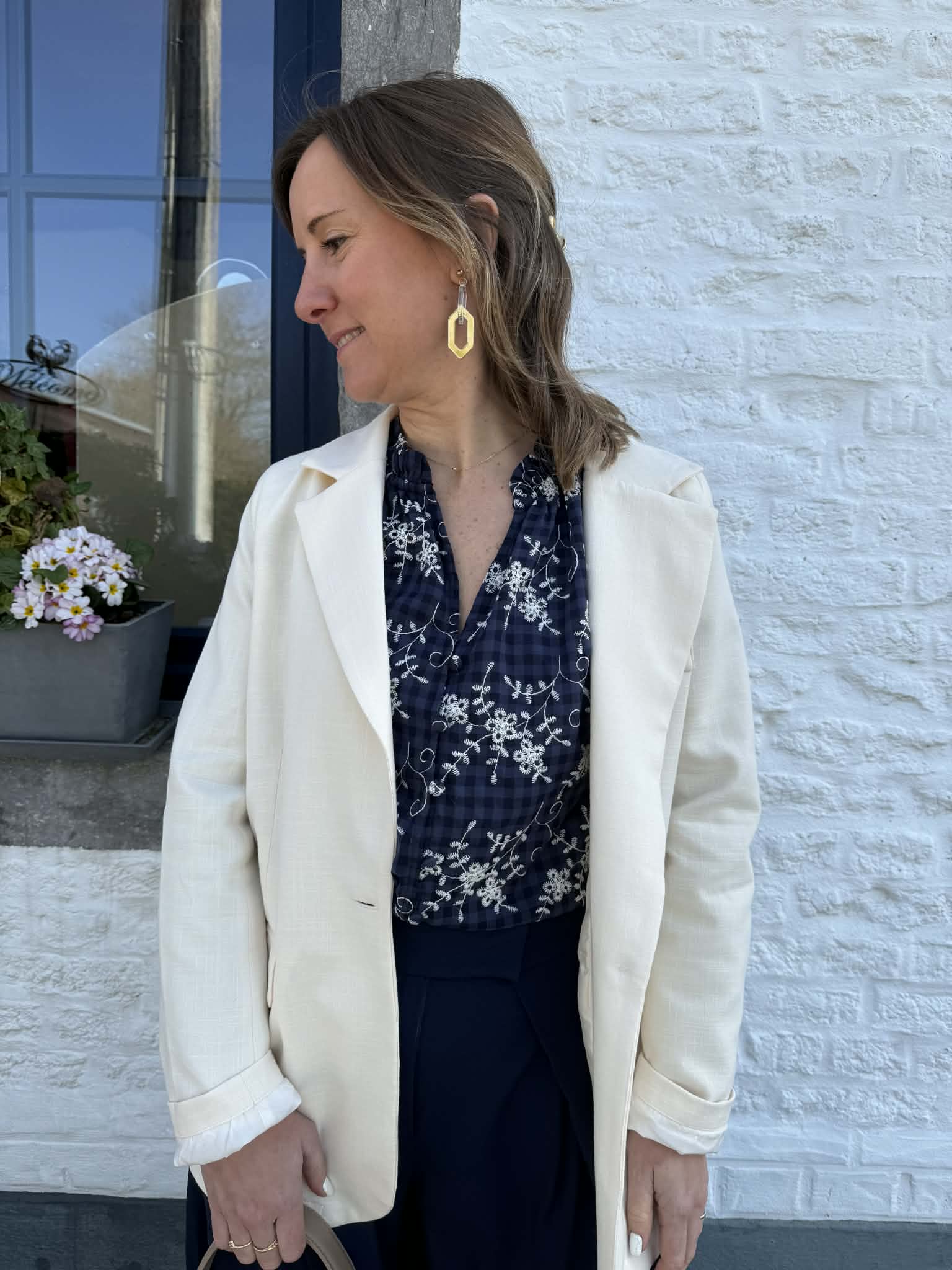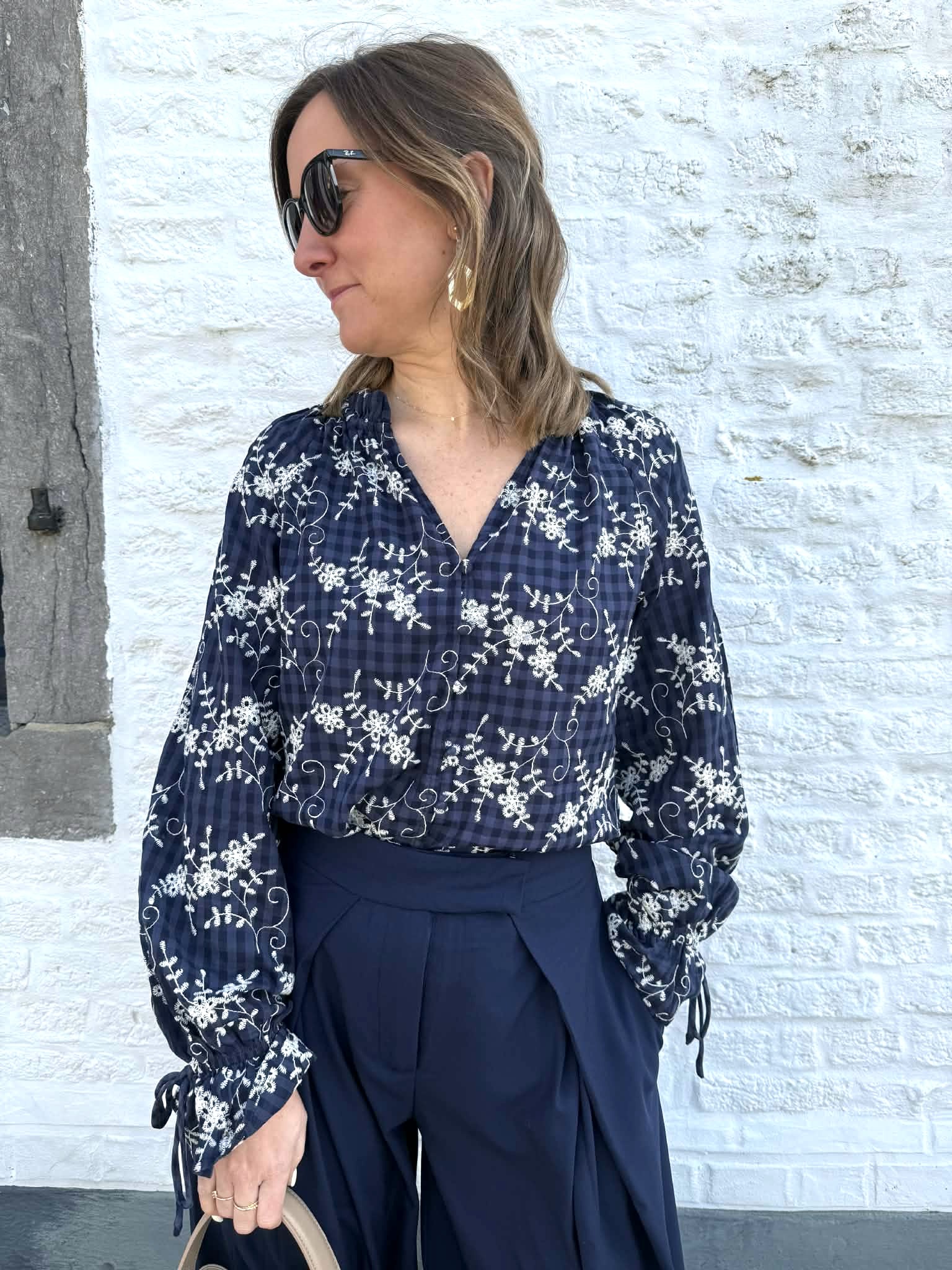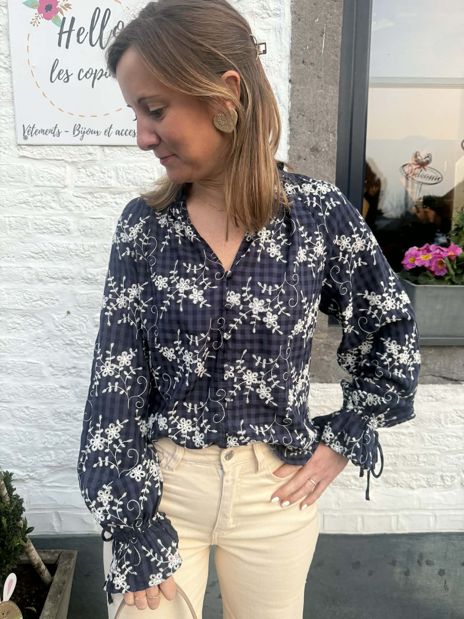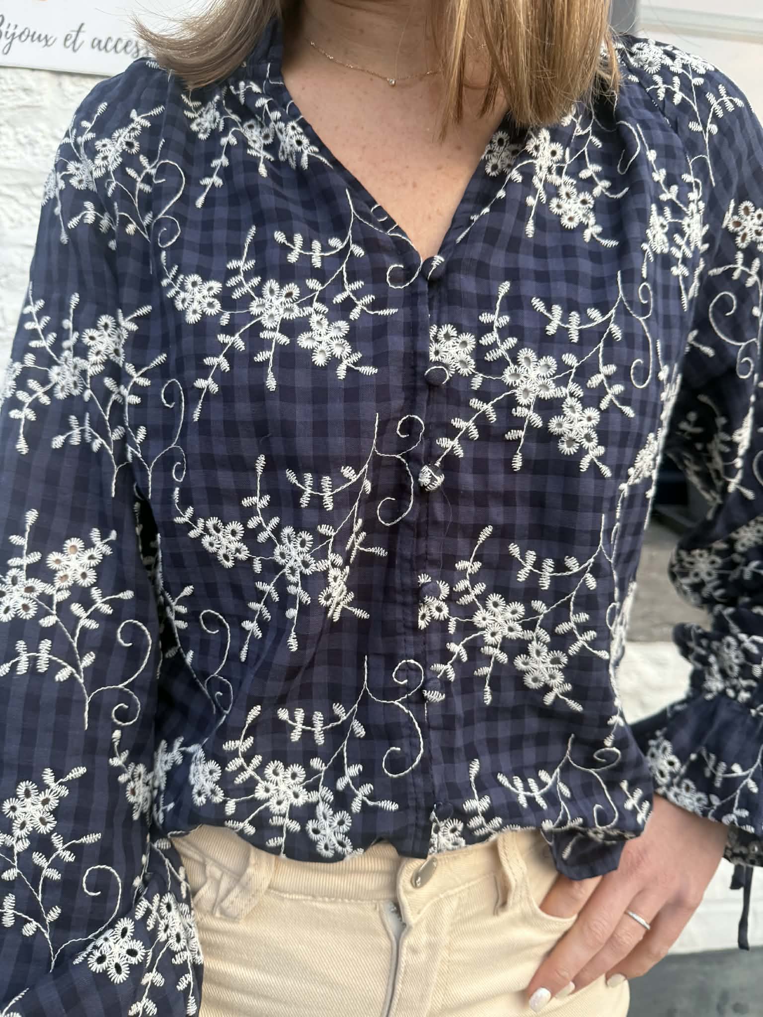 Jolie blouse bleu marine et écru avec un fond à petits carreaux et des détails de broderie fleuris.