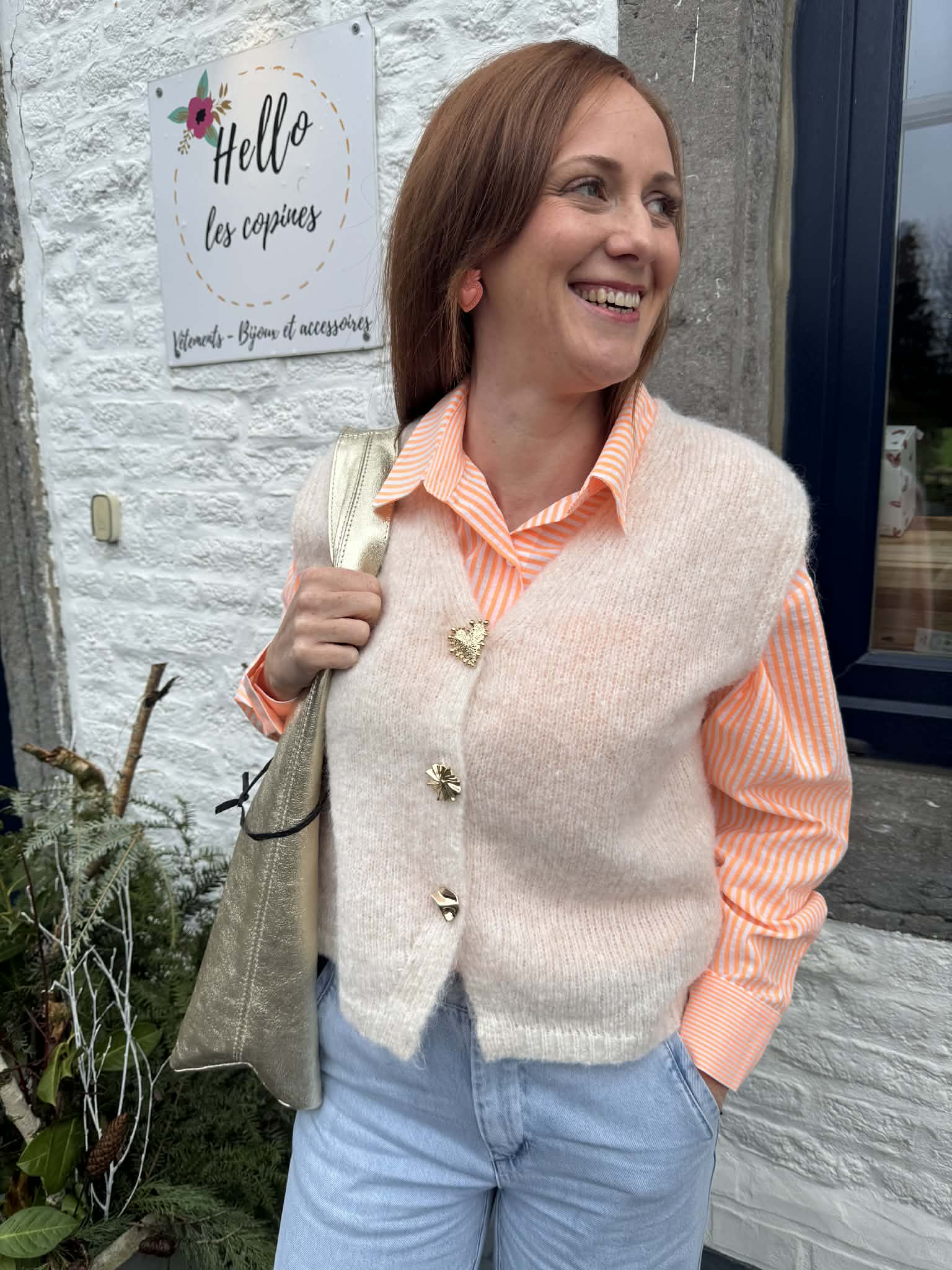 Chemise rayée orange-écru, à adopté seule ou avec un pull sans manche ou le long gilet orange.