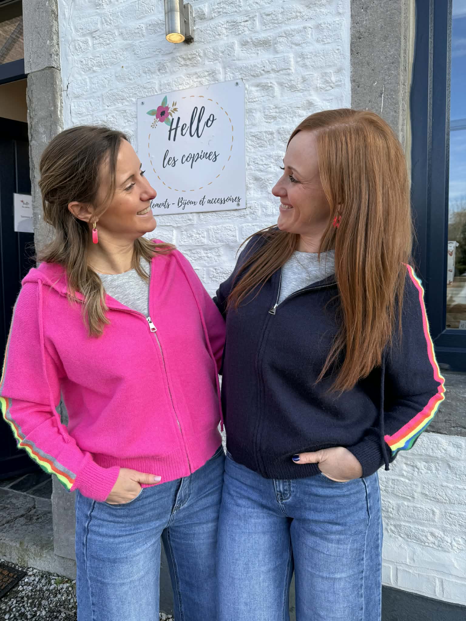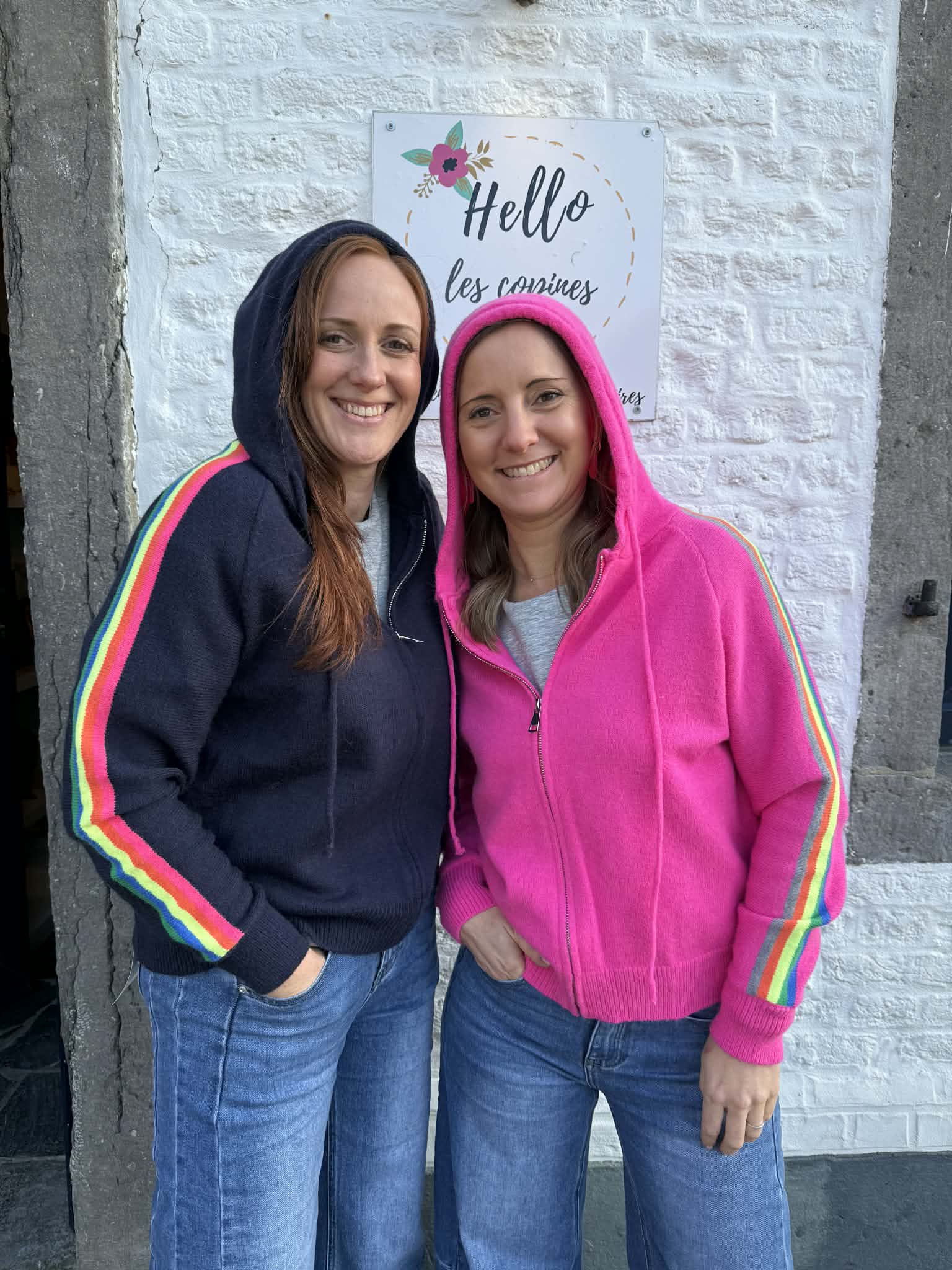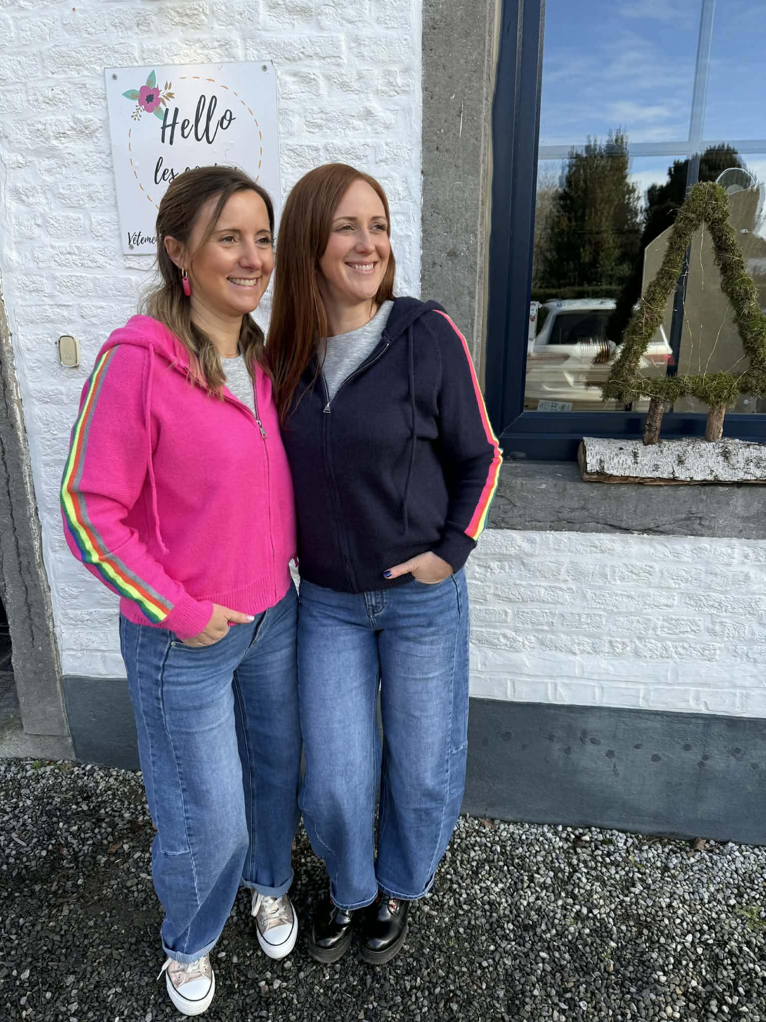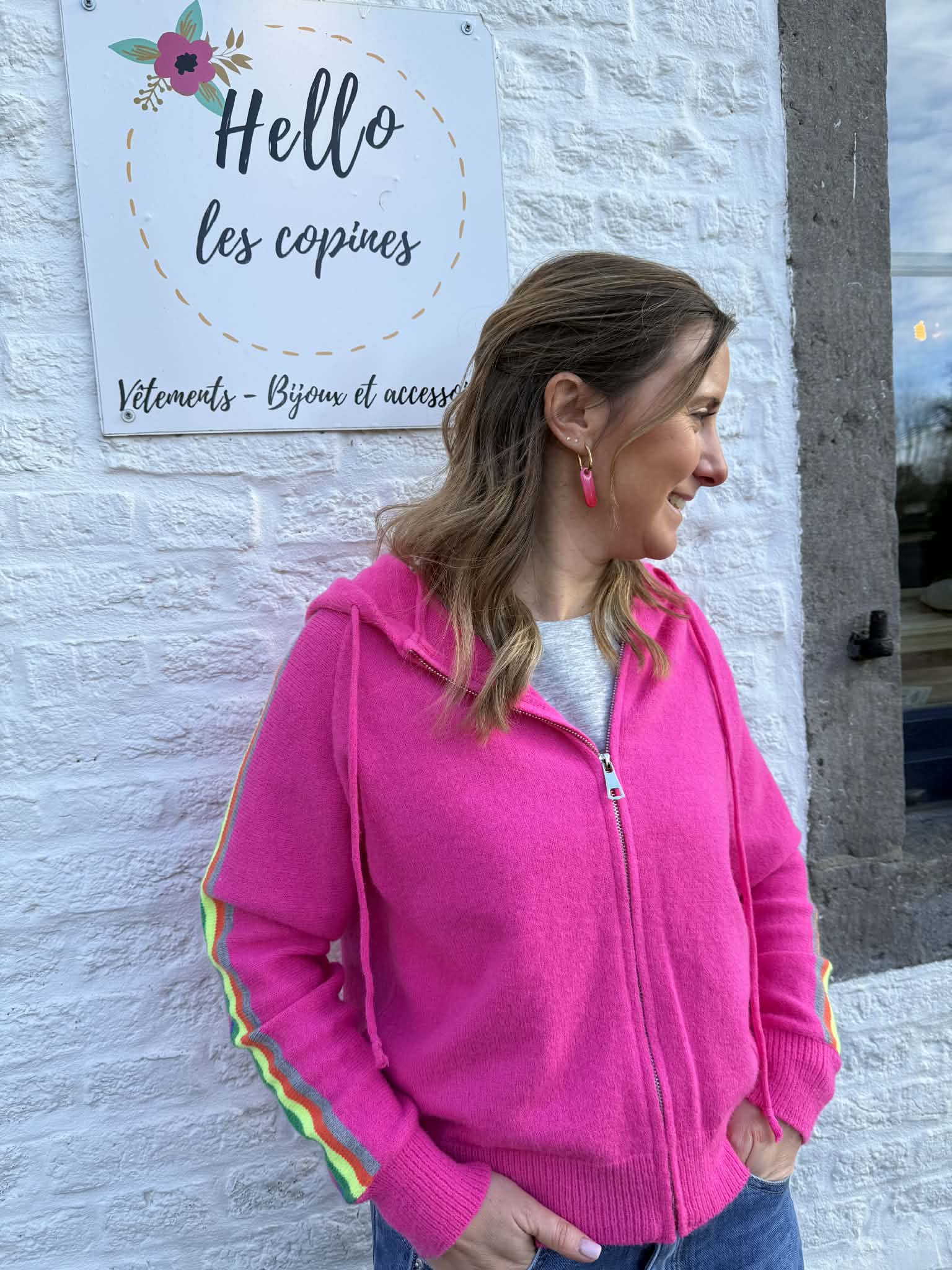 Gilet avec tirette et capuche, bandes de couleurs sur les manches.