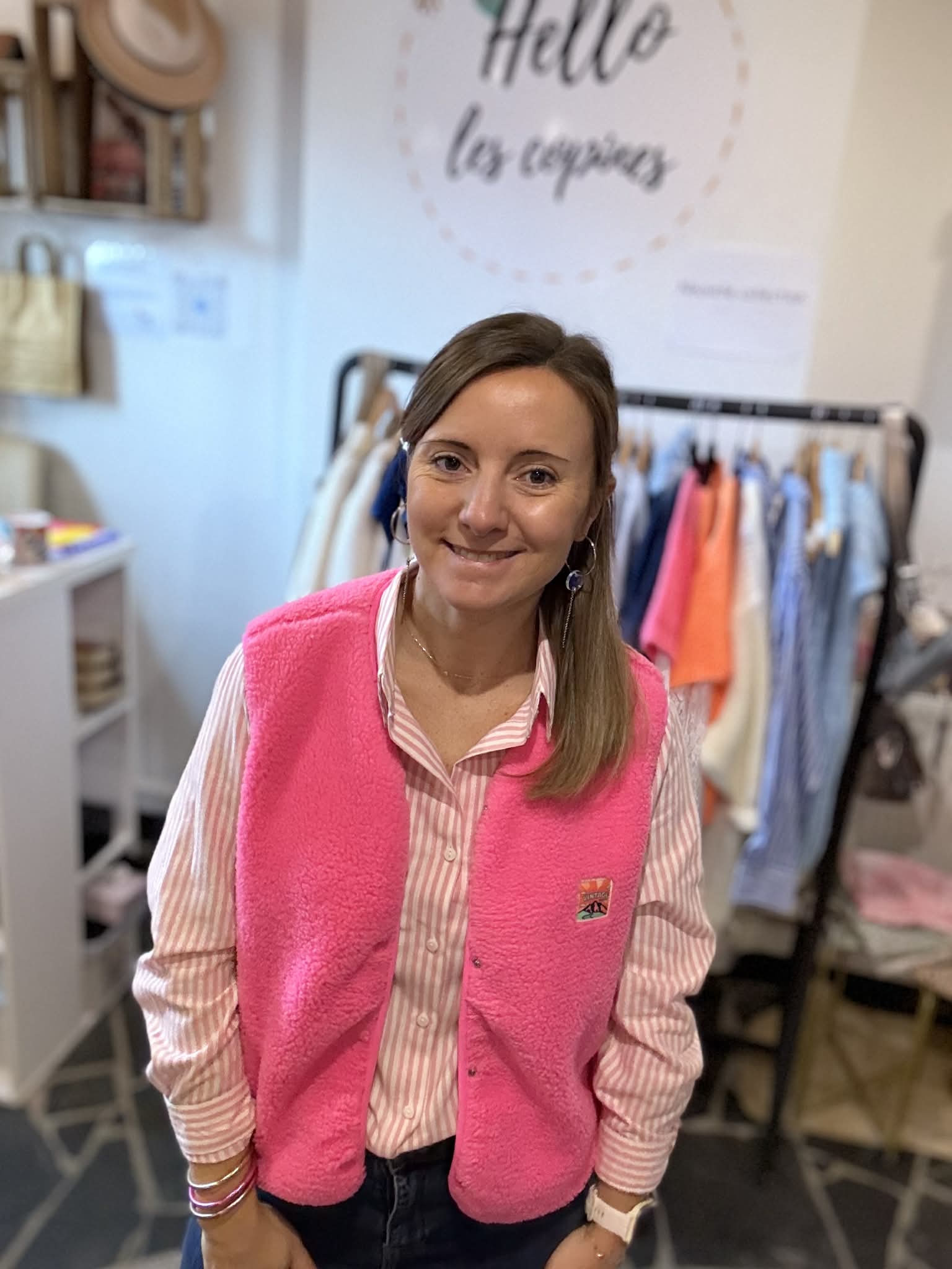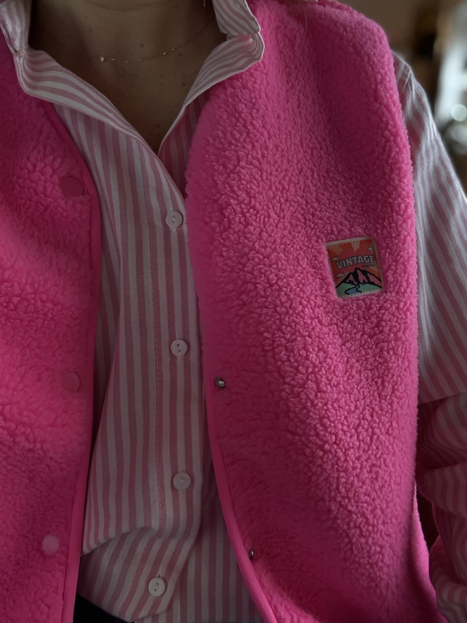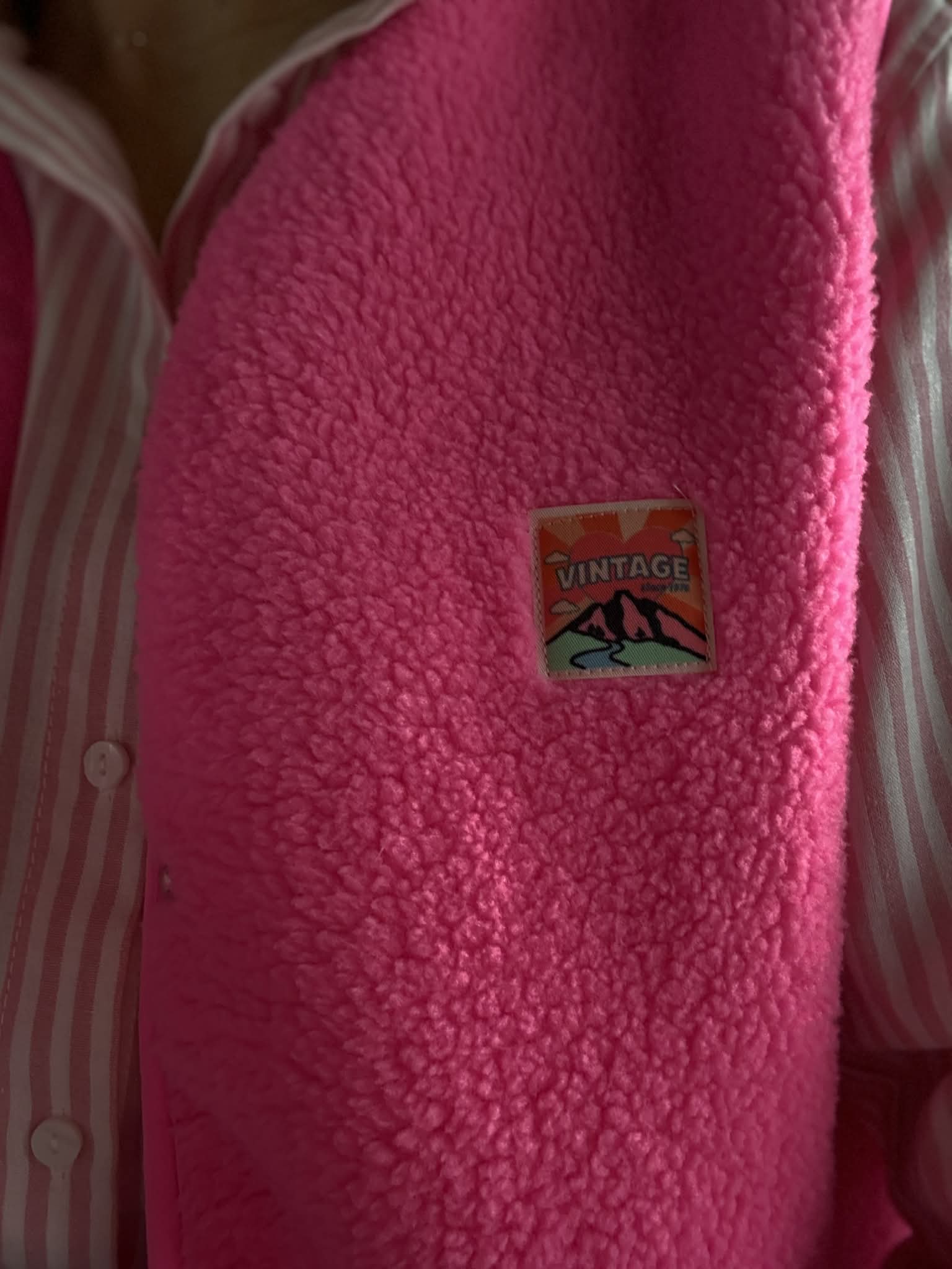 Gilet mouton sans manche rose avec écusson coloré (écriture : vintage)