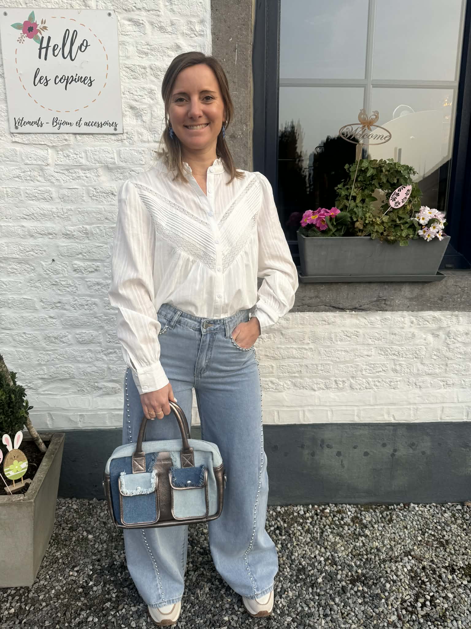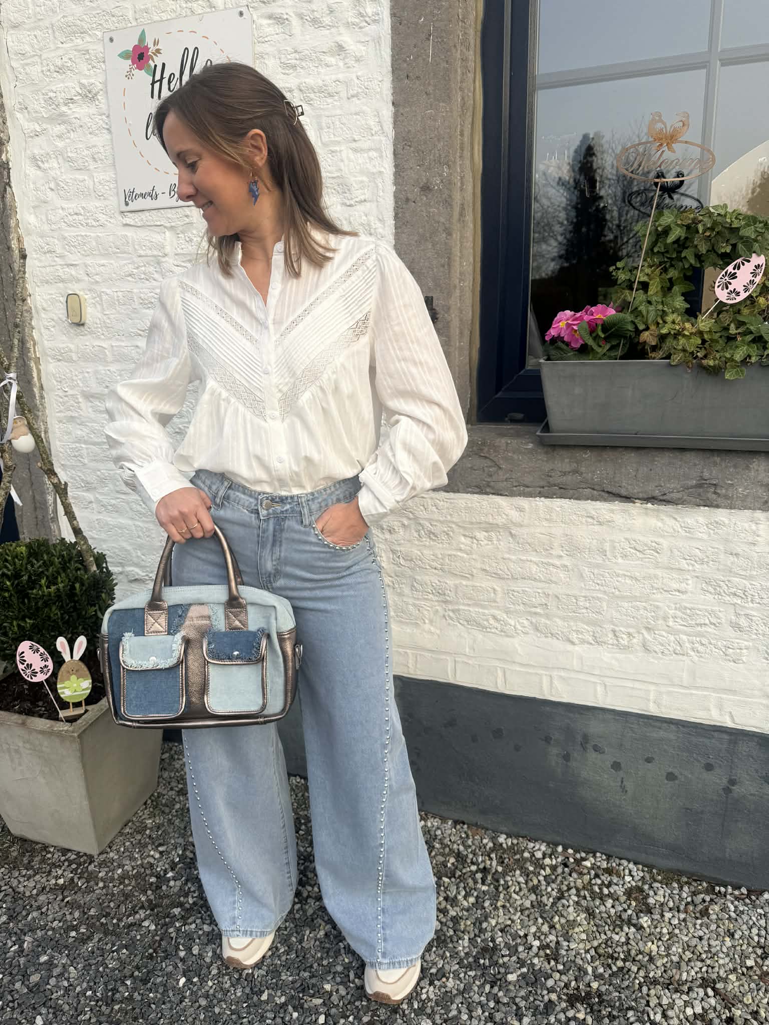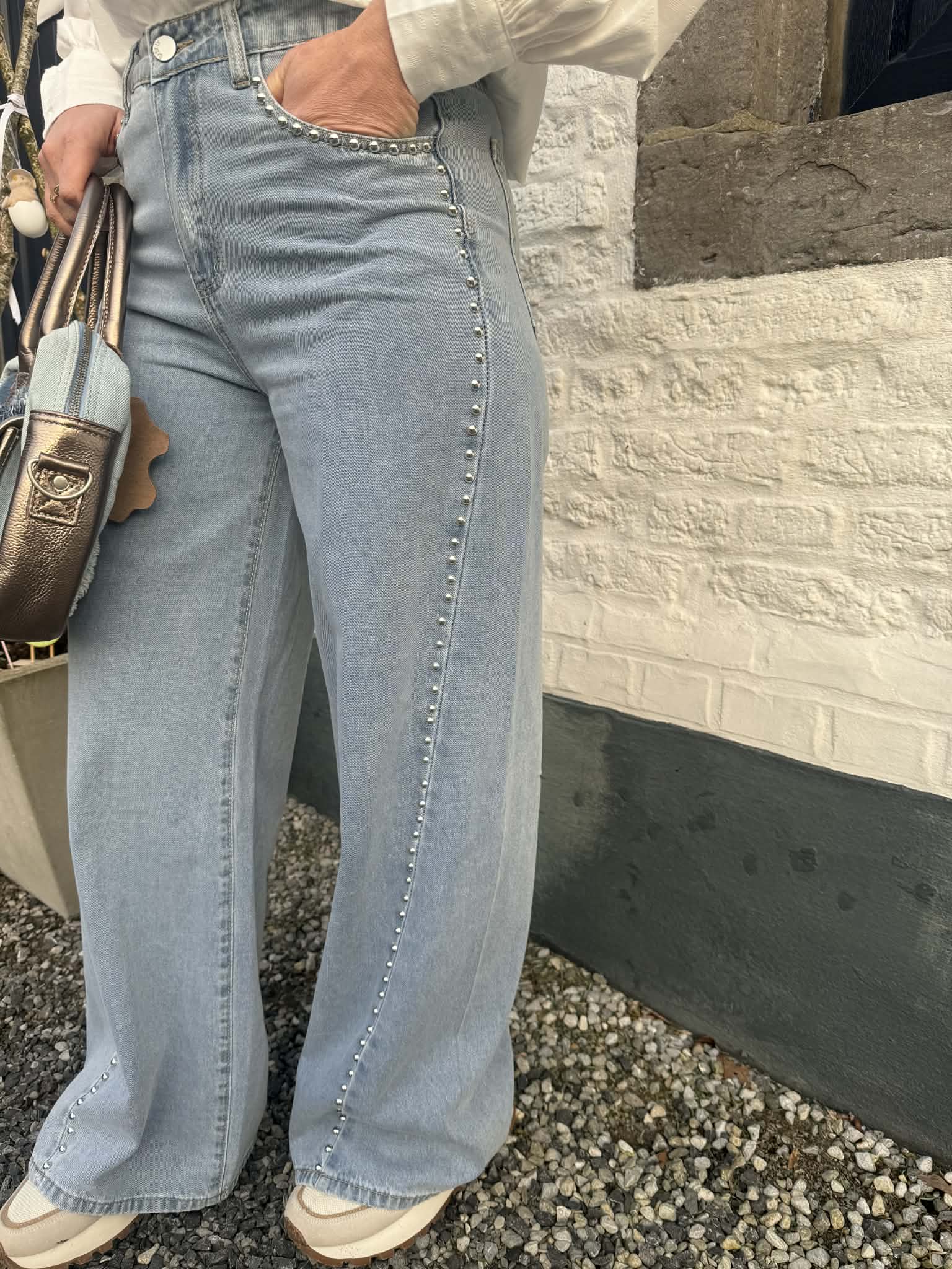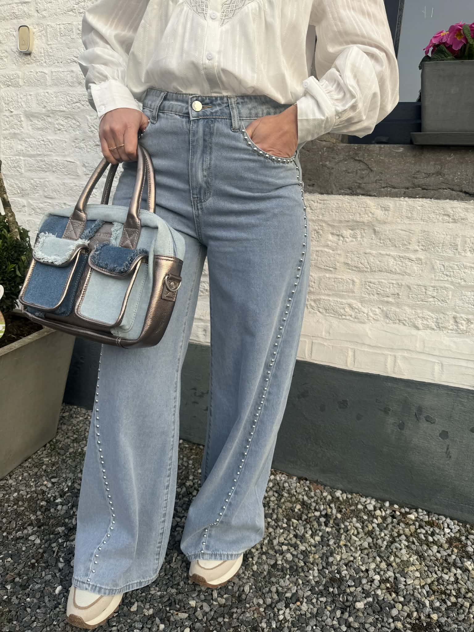 Jeans palazzo en denim clair avec des petits clous intégrés de couleur argent clair pour un look rock, tendance et stylé.