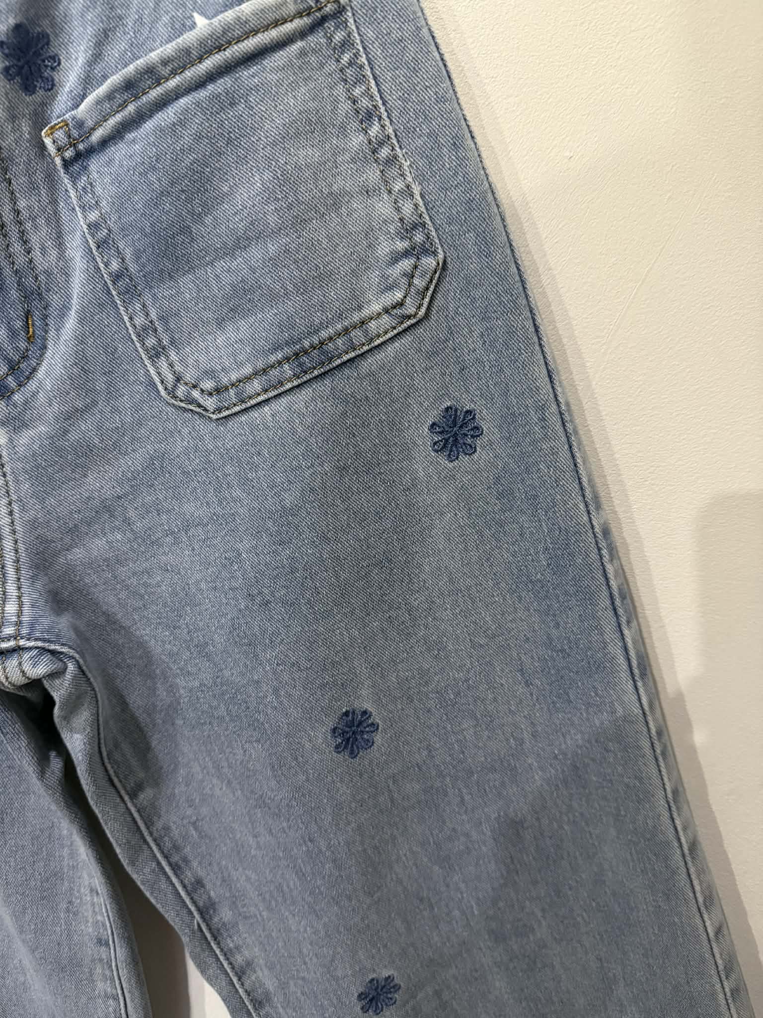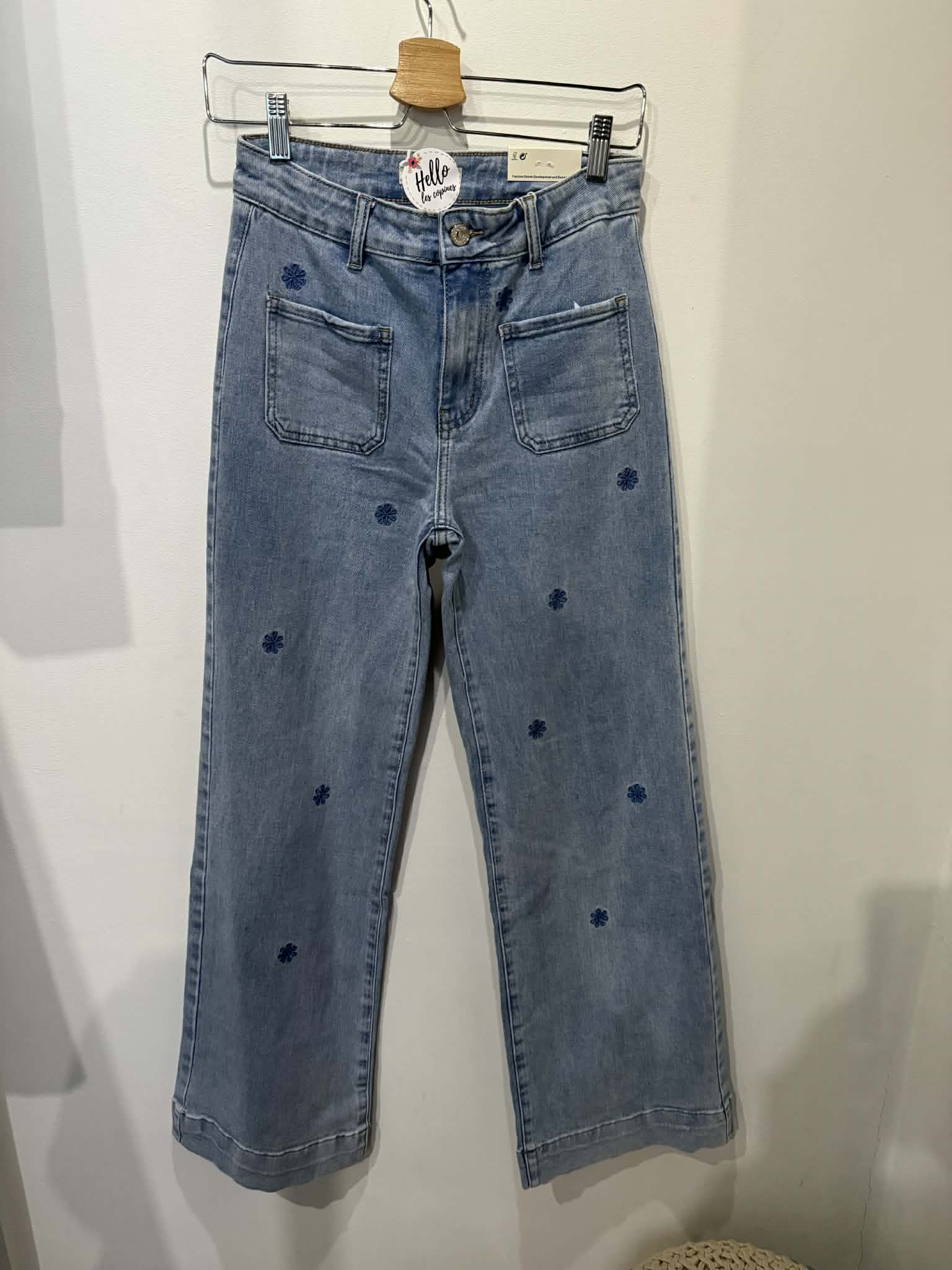 Jeans wide leg (coupe évasée, ample des hanches jusqu’aux chevilles), en bleu clair avec des fleurs brodées sur le devant.