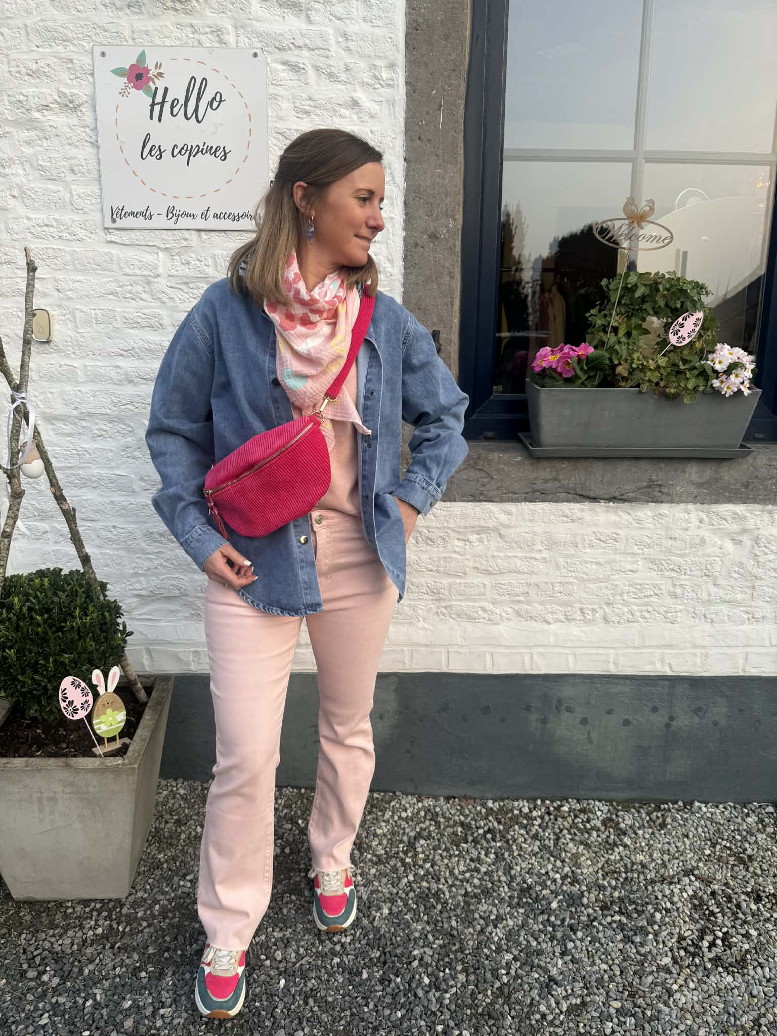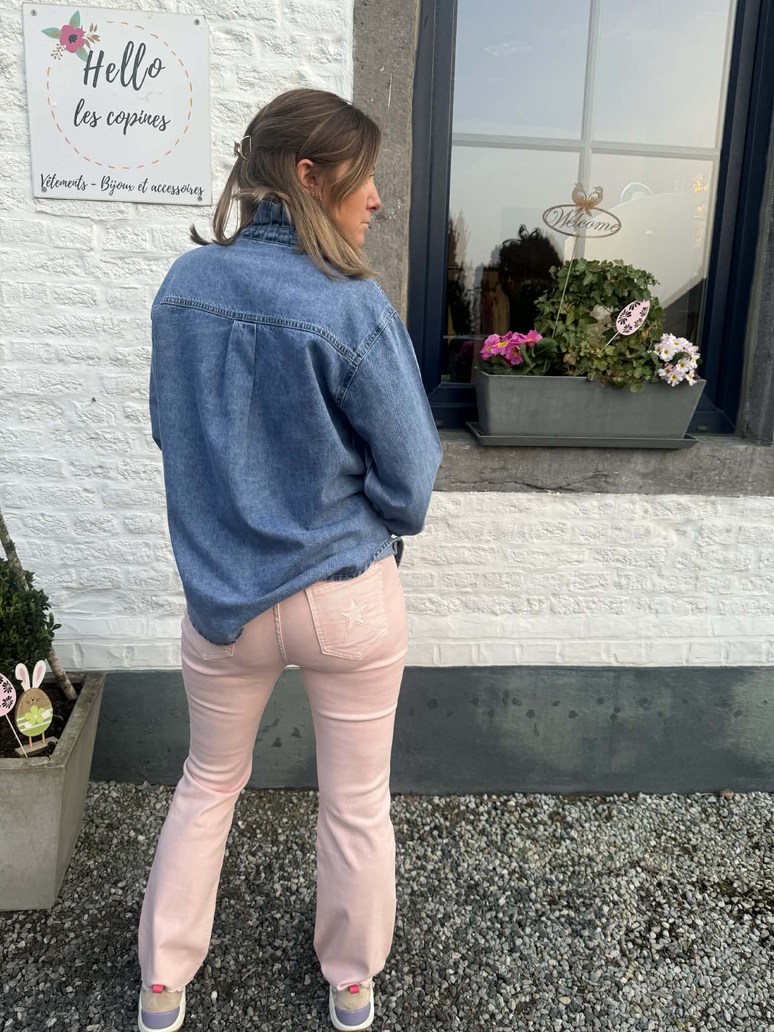Jeans slim droit confort rose clair, simplement coupé dans le fond, étoile sur une poche des fesses