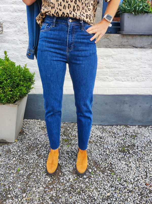 Le jean Maryline, possède une coupe momfit sur la jambe, coupé à la cheville.