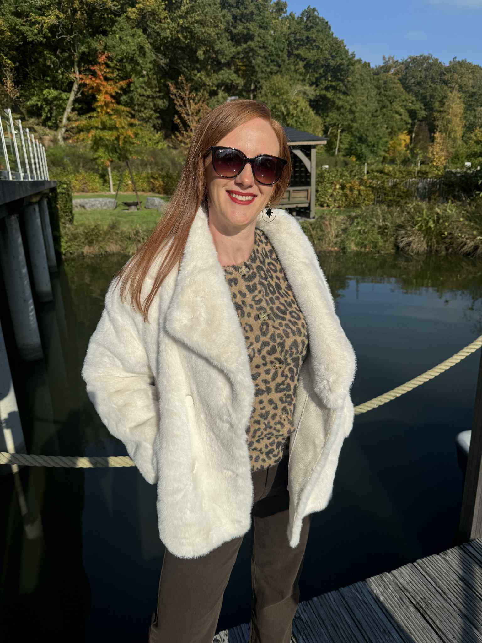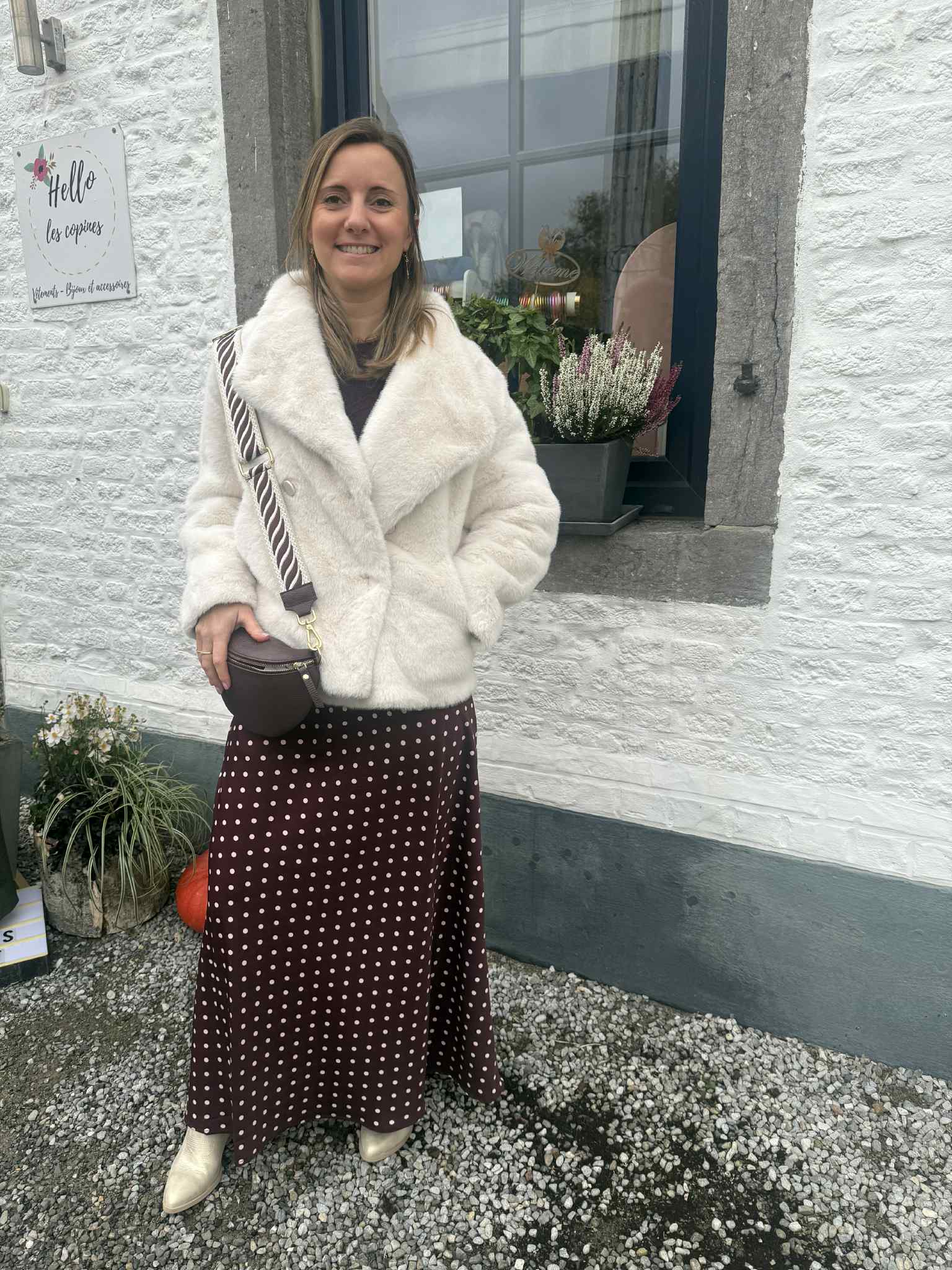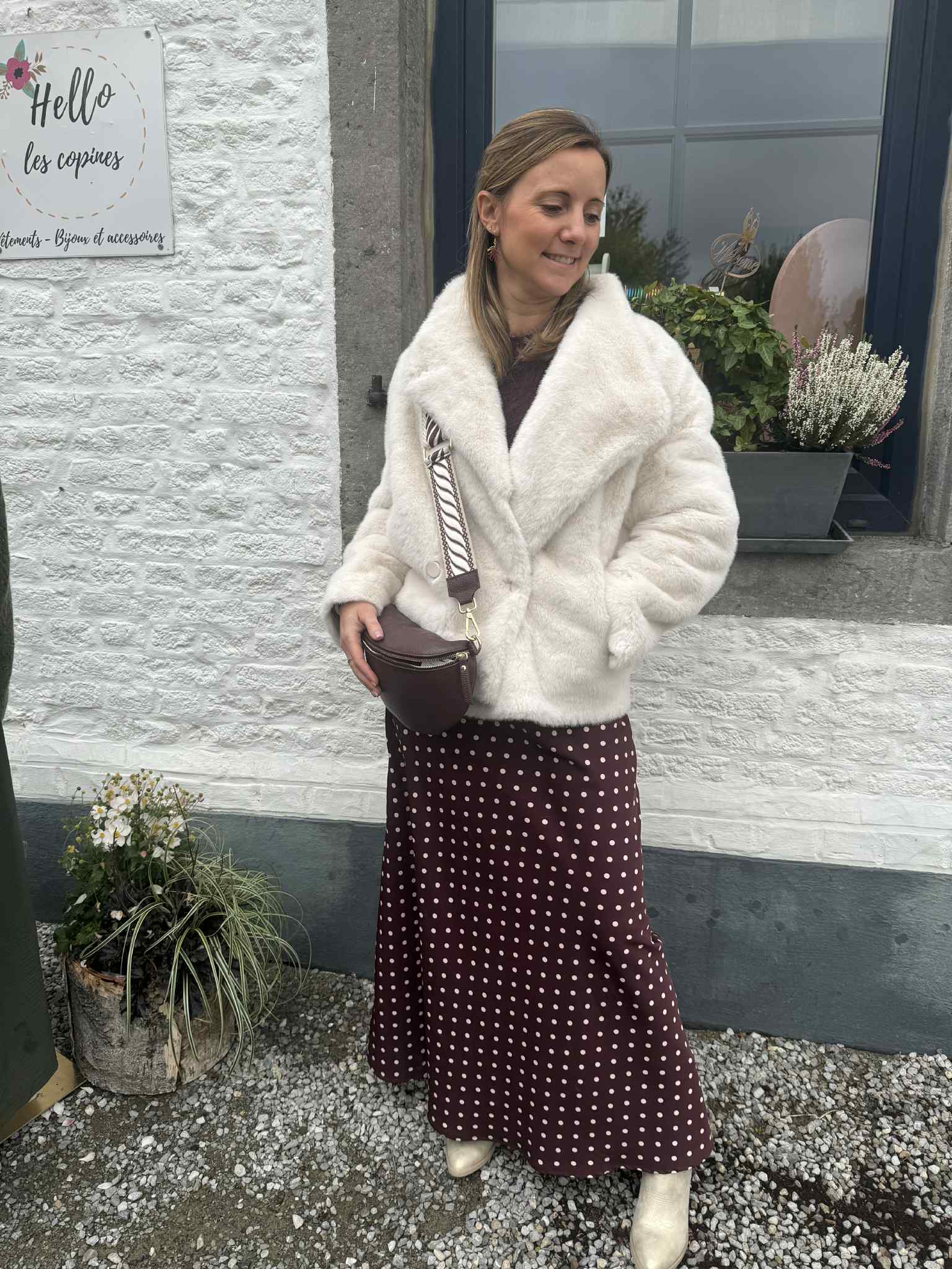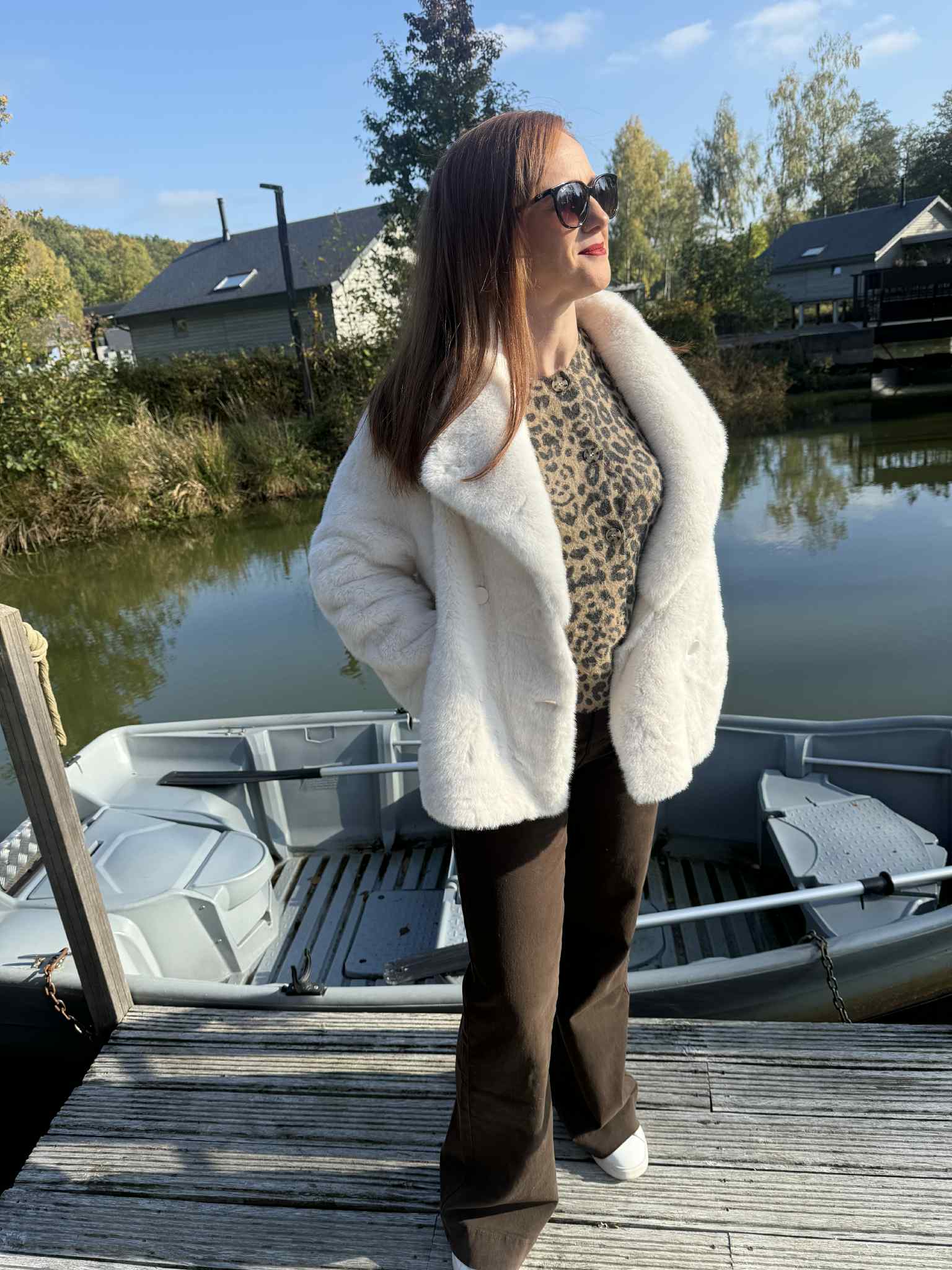 Superbe manteau fausse fourrure de couleur écru avec col v et boutons, a des poches