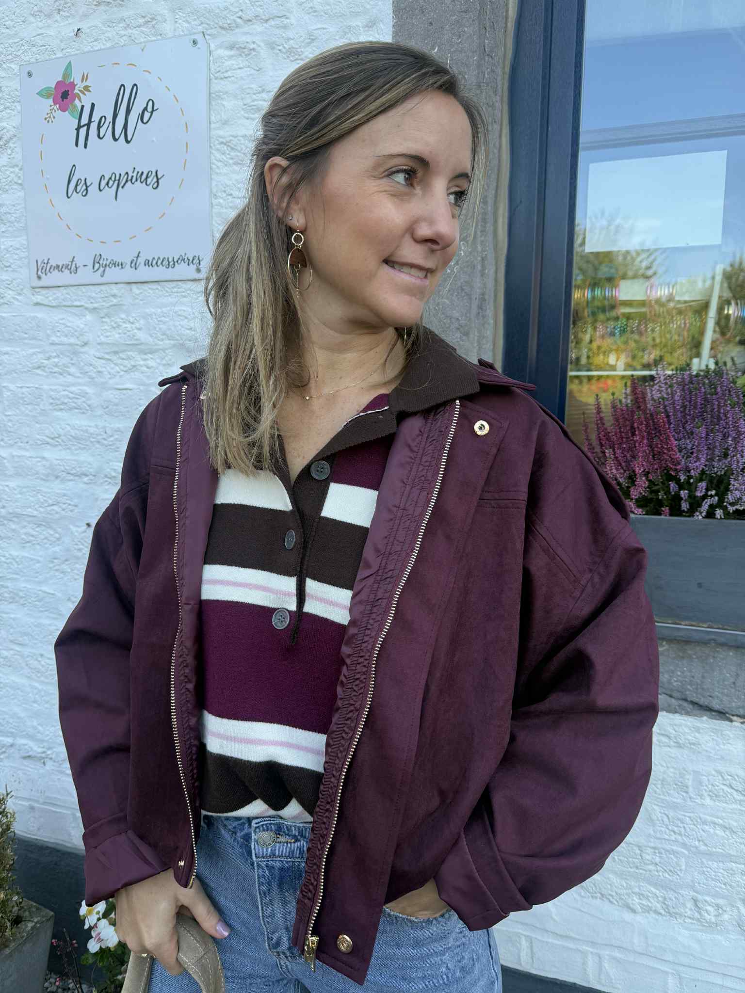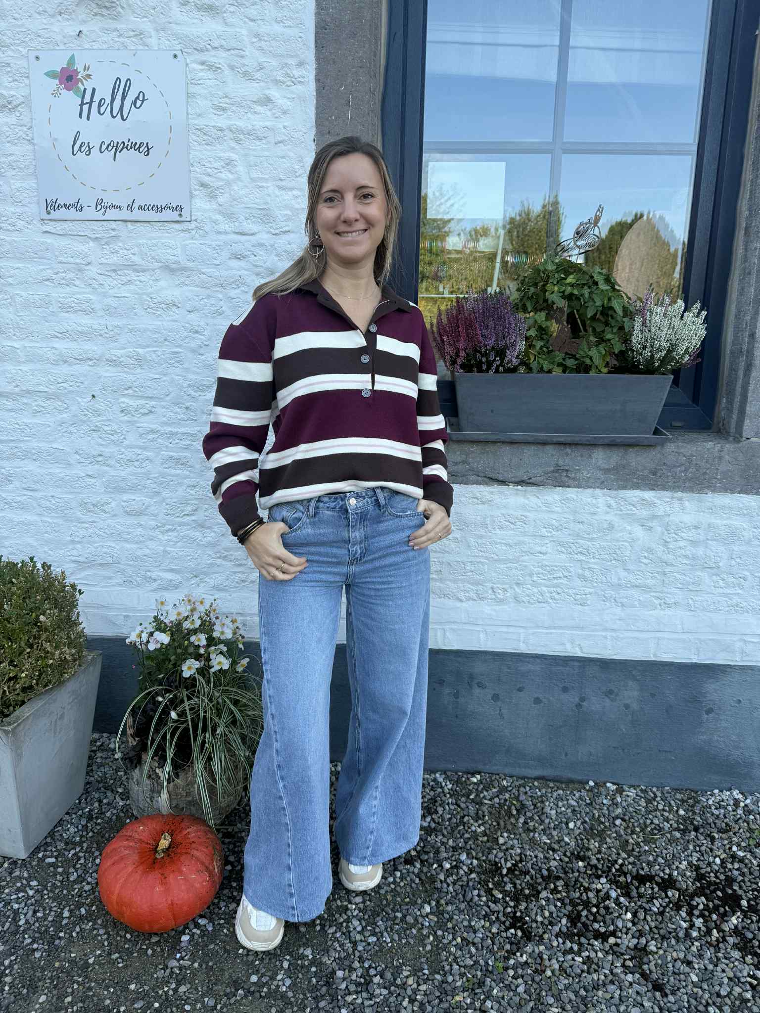 Pull-polo ligné dans les magnifiques tons tendance chocolat, bordeaux et écru pour un look casual et tendance.