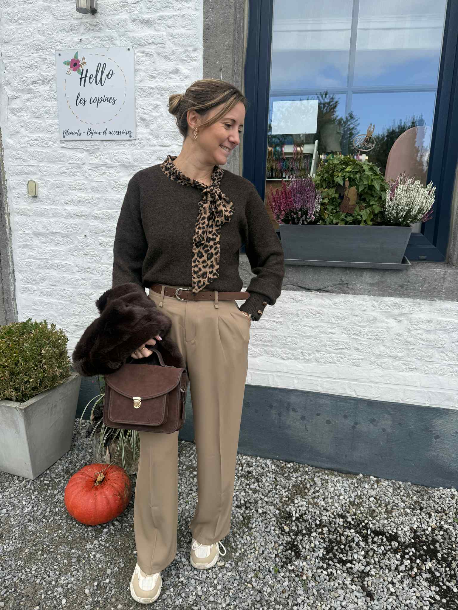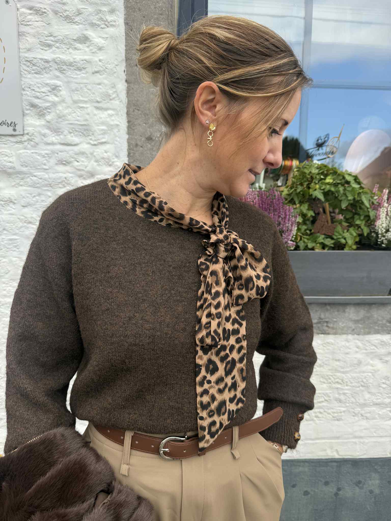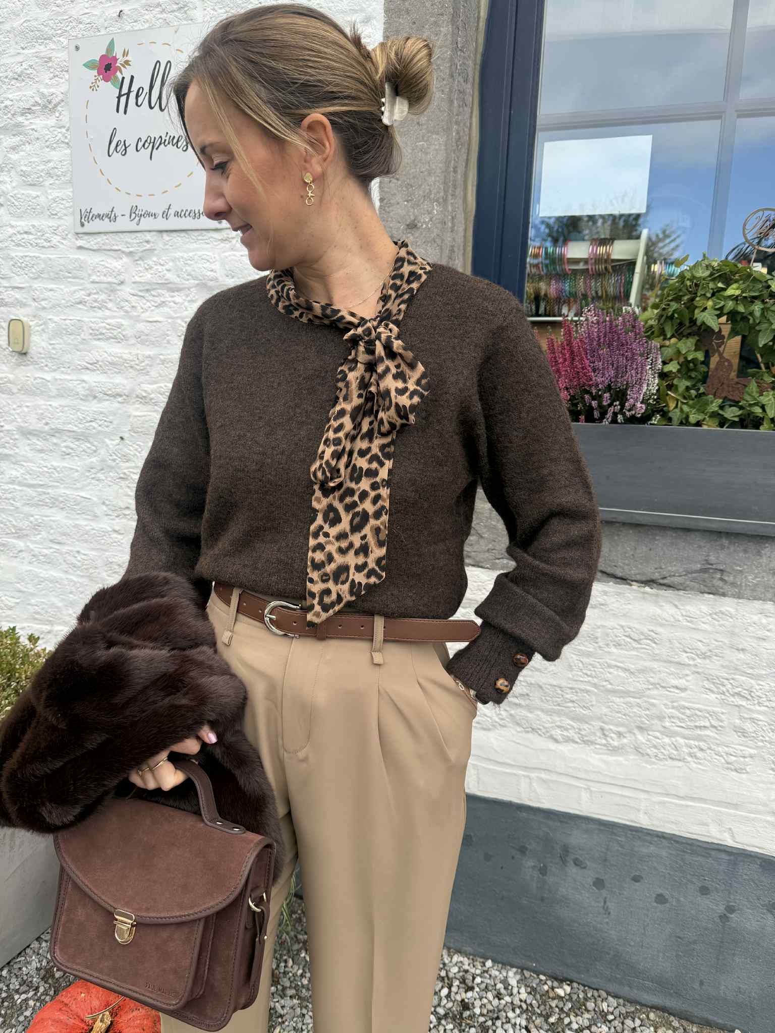 Magnifique pull chocolat accompagné d’un ruban leopard au col donnant un effet de foulard