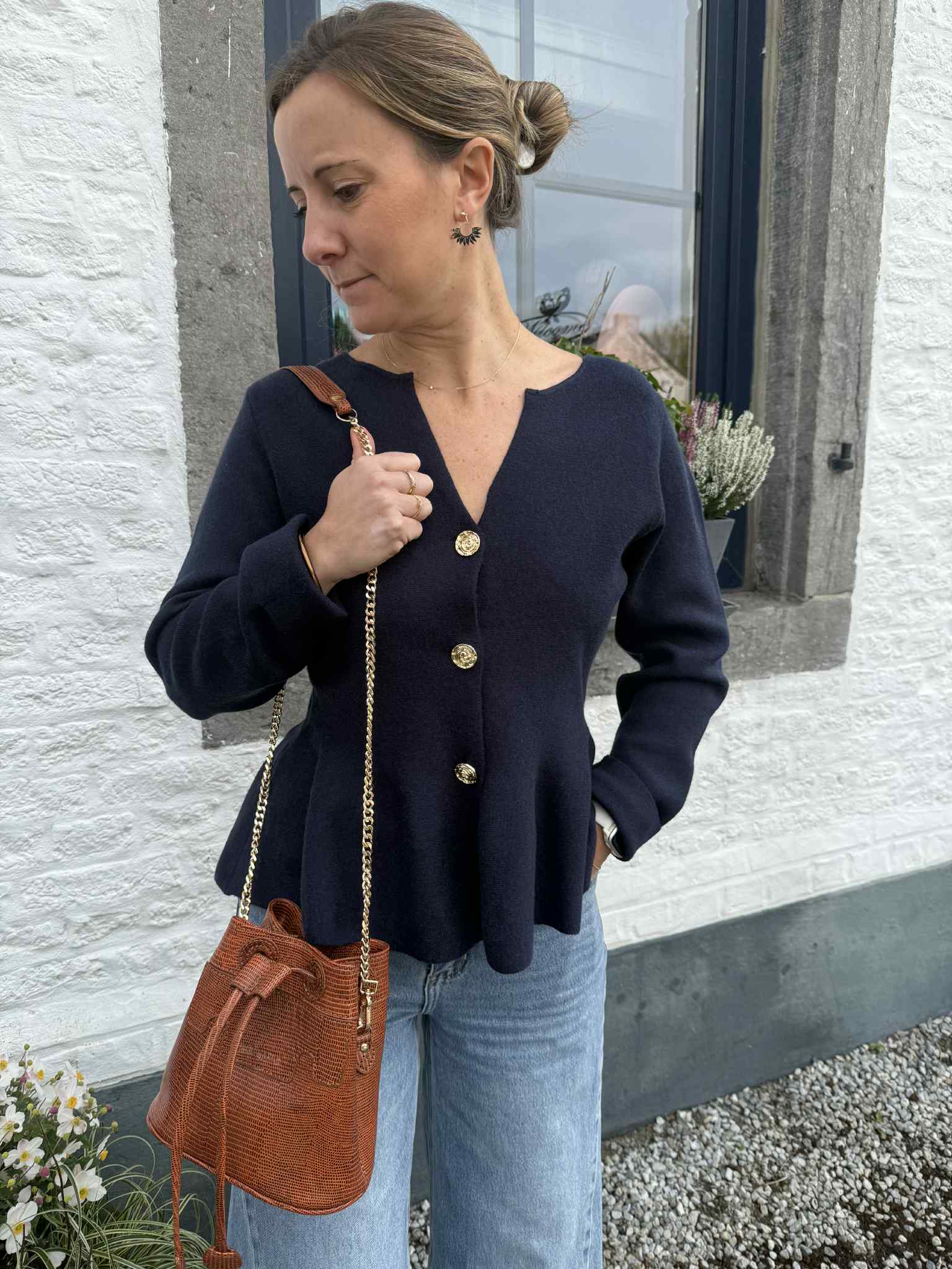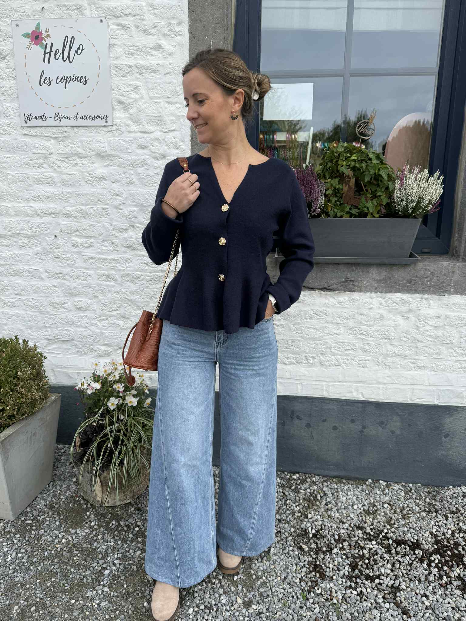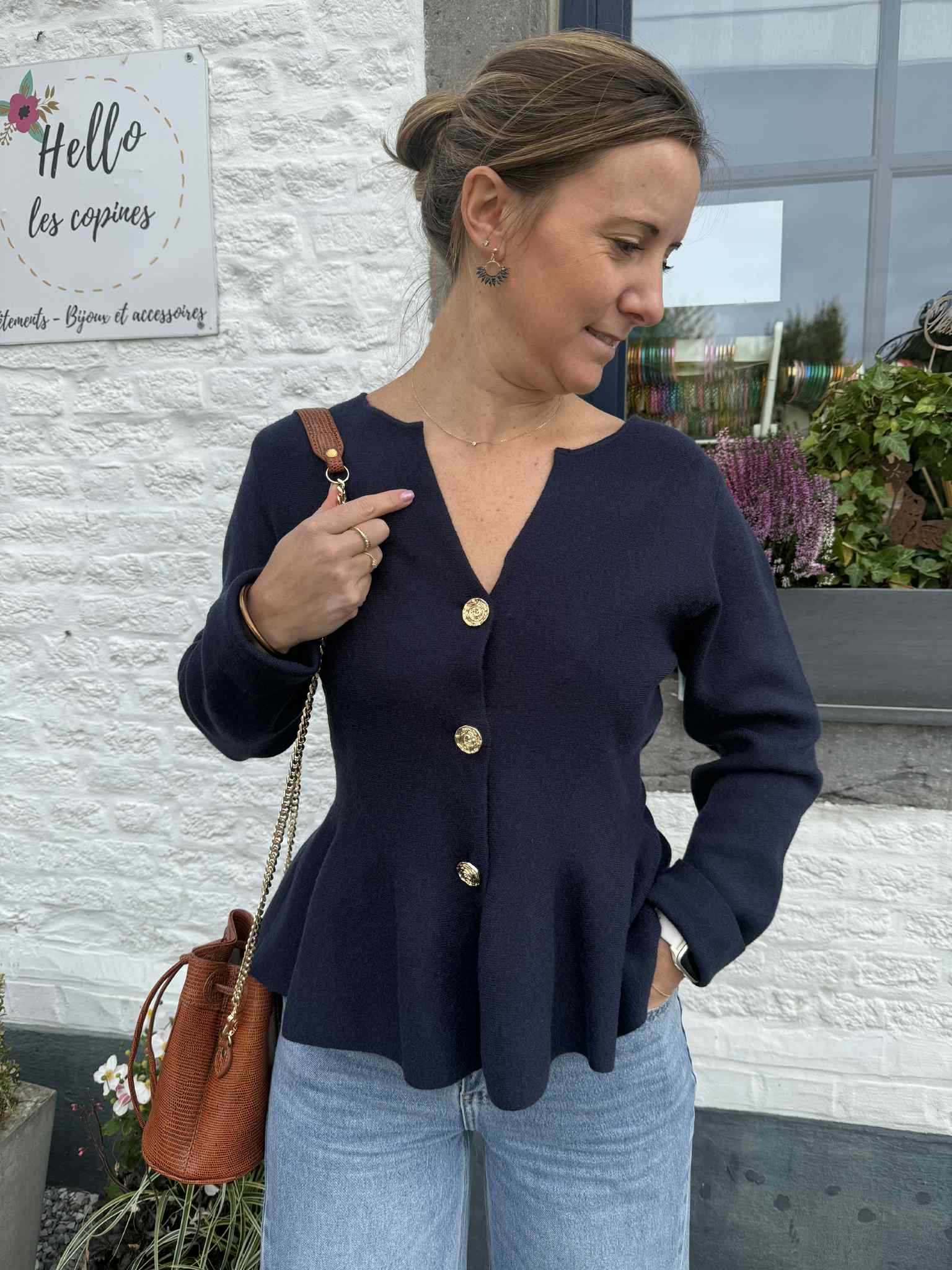 Pull fin sans laine avec de jolis boutons dorés et un plissage pour un effet tendance.