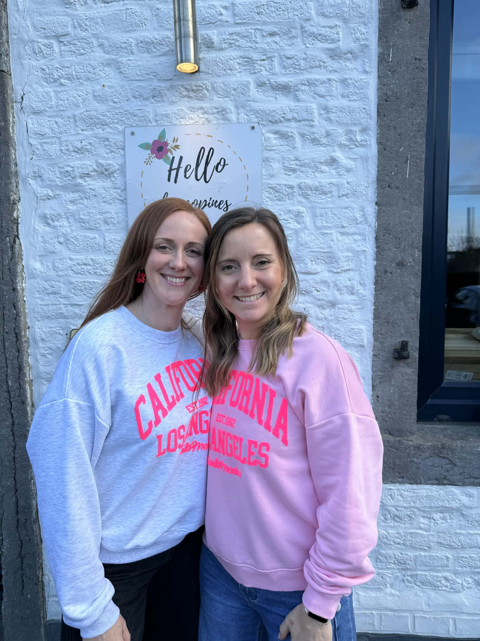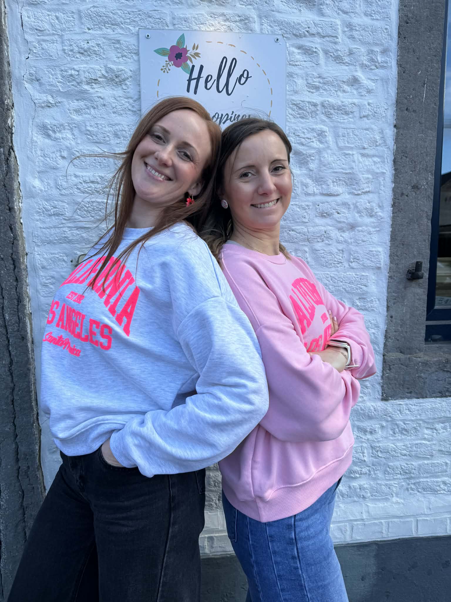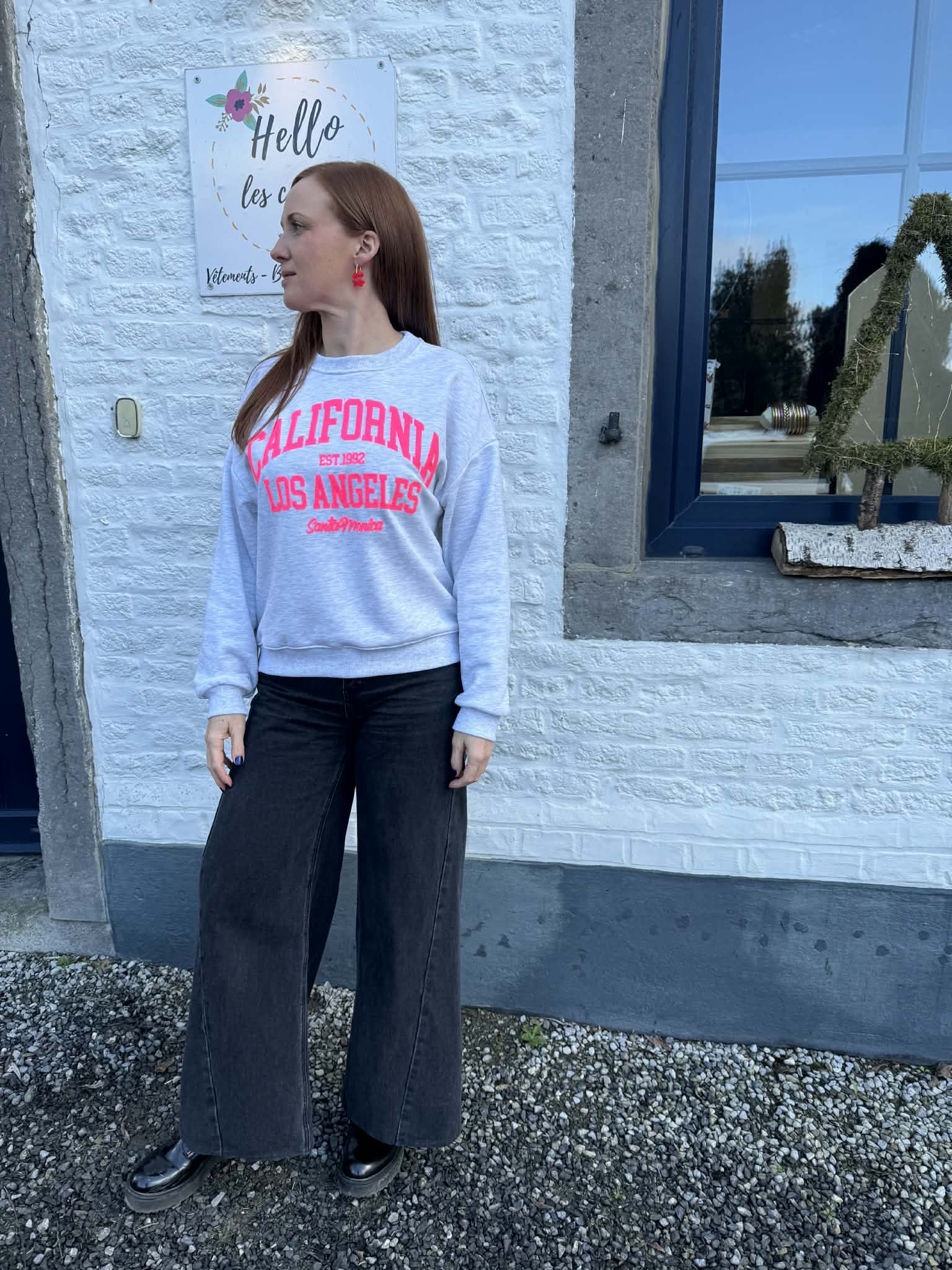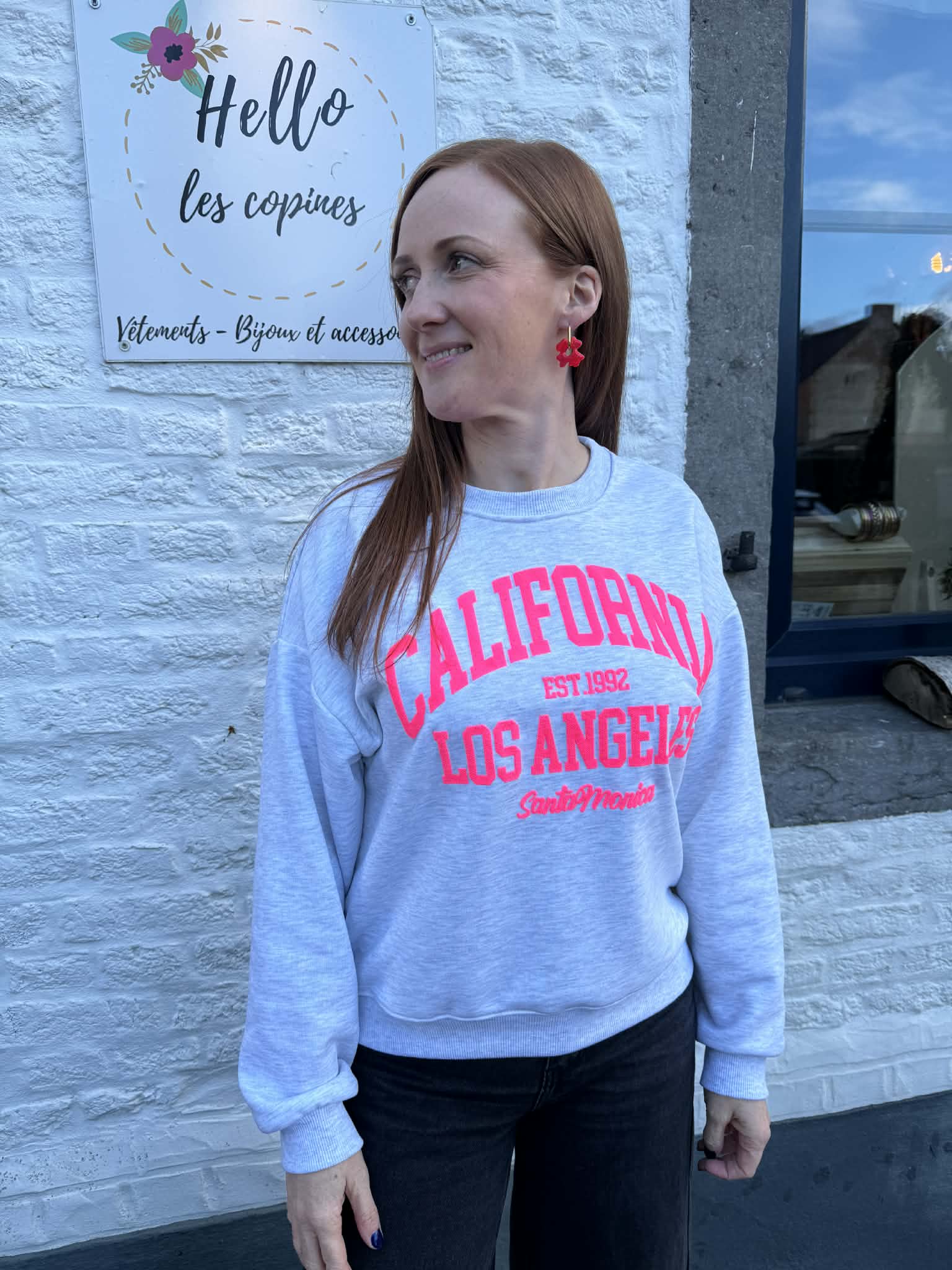 Sweat fin gris clair avec écritures en rose fluo
