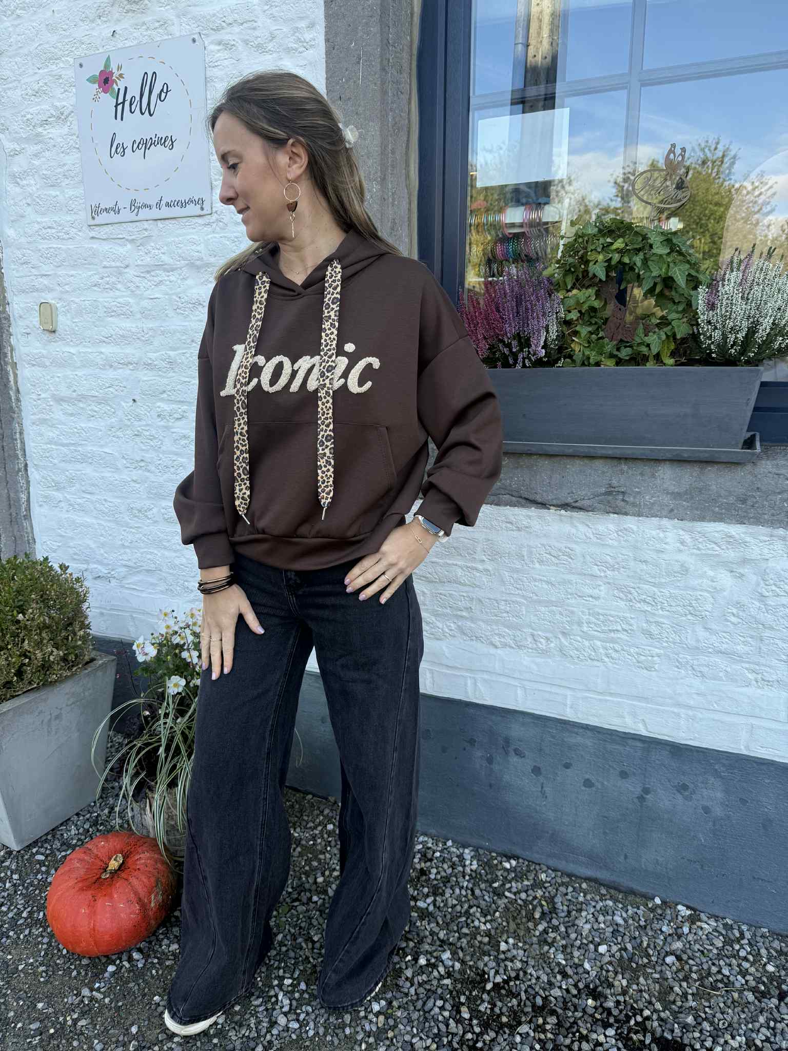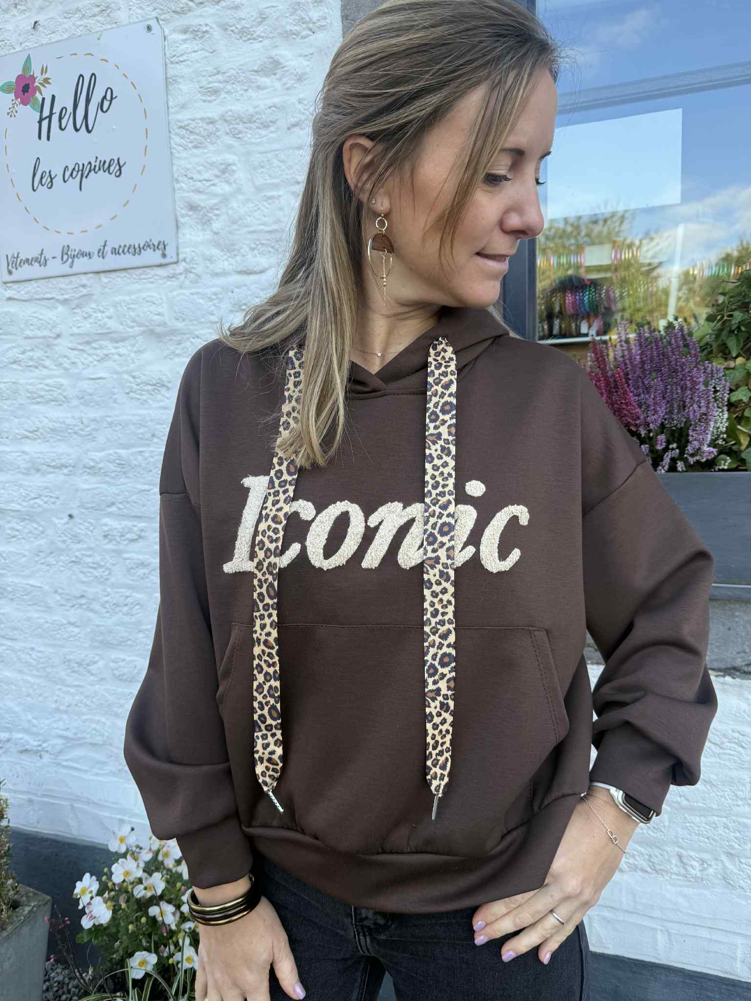 Sweat chocolat avec écriture mouton « Iconic » et ruban leopard venant de la capuche