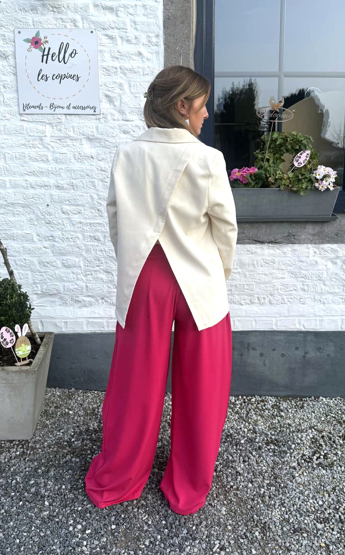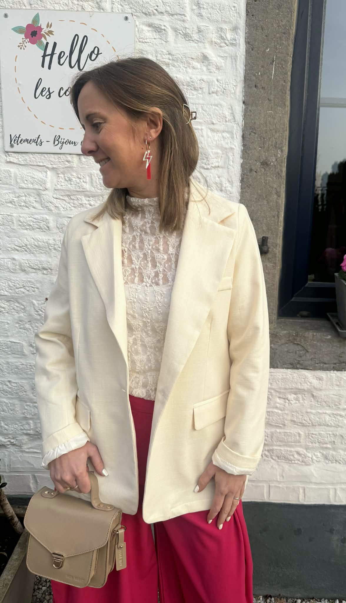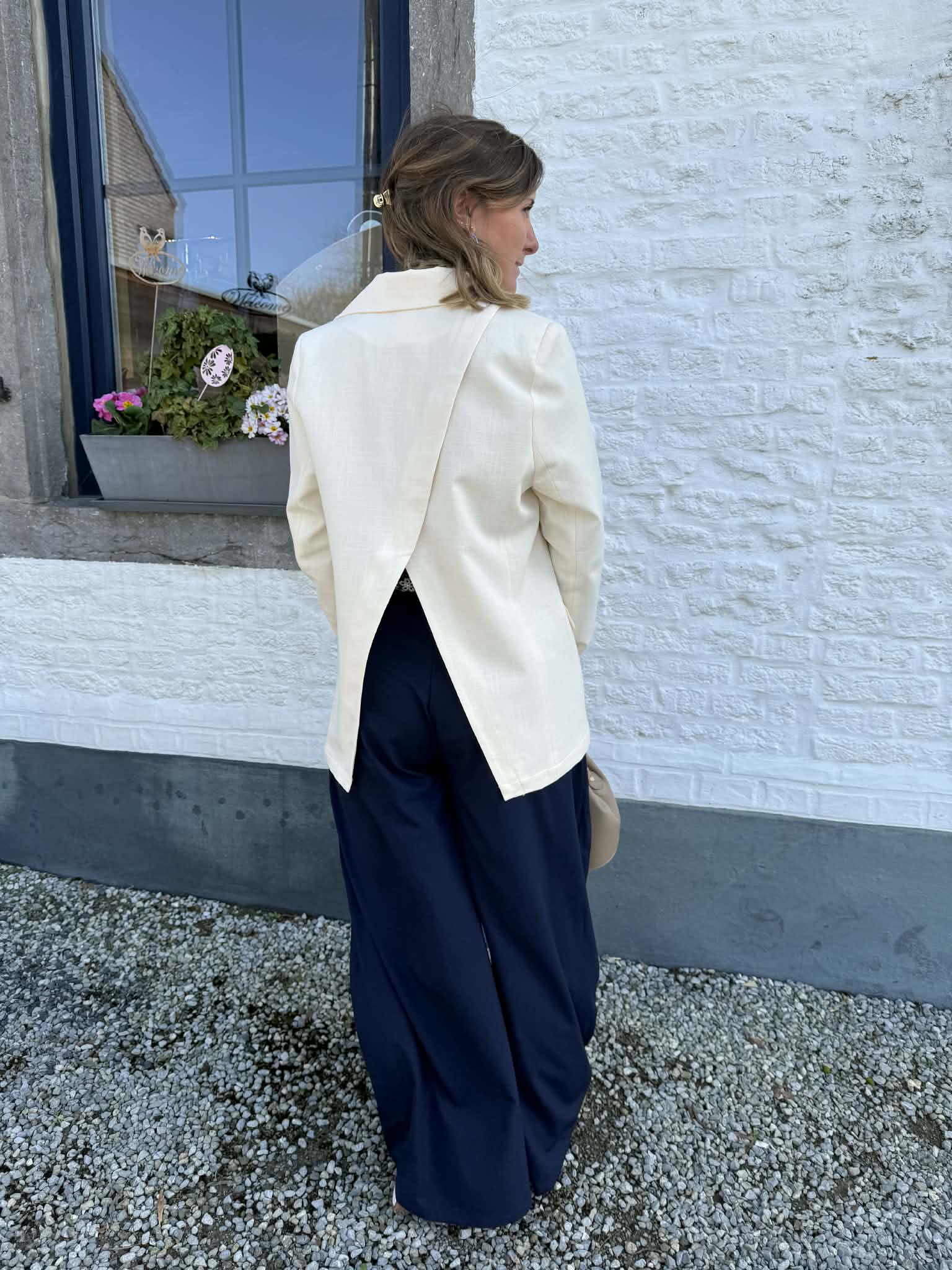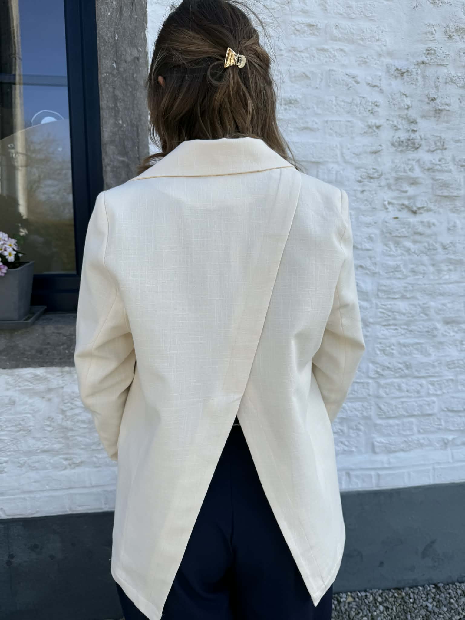 Veste tailleur écru avec ouverture dans le dos, en coton et en lin pour un style habillé et tendance ou casual et moderne.