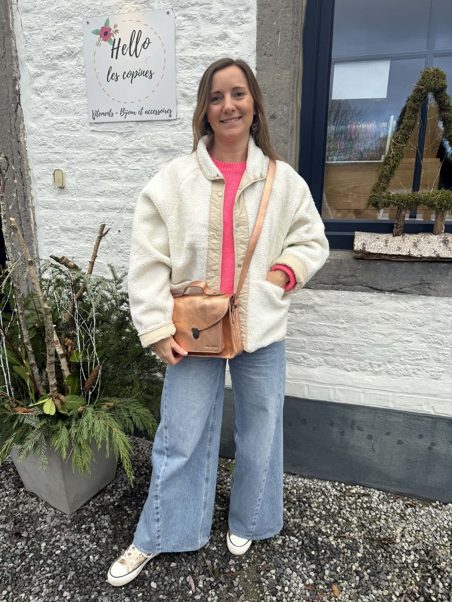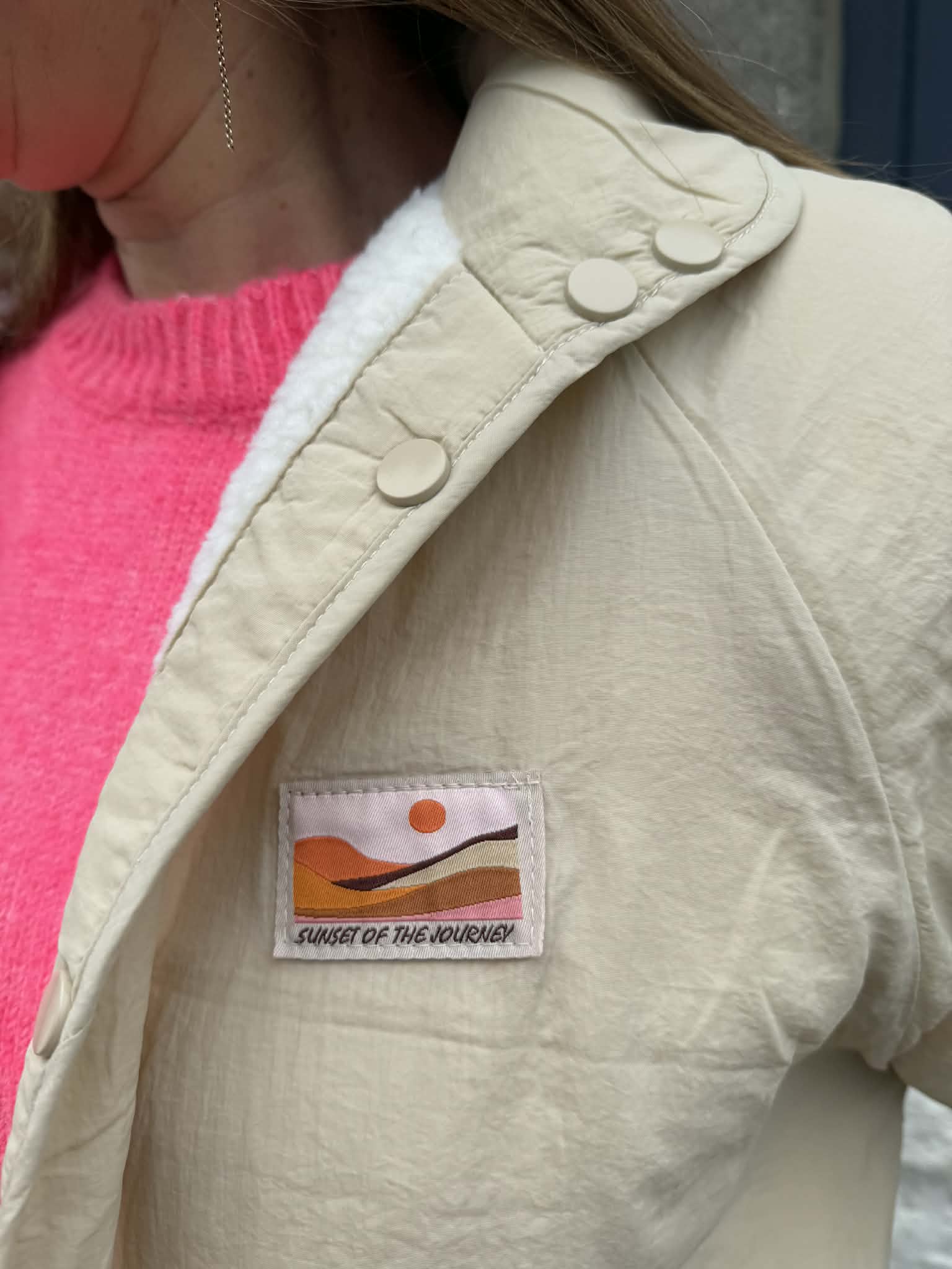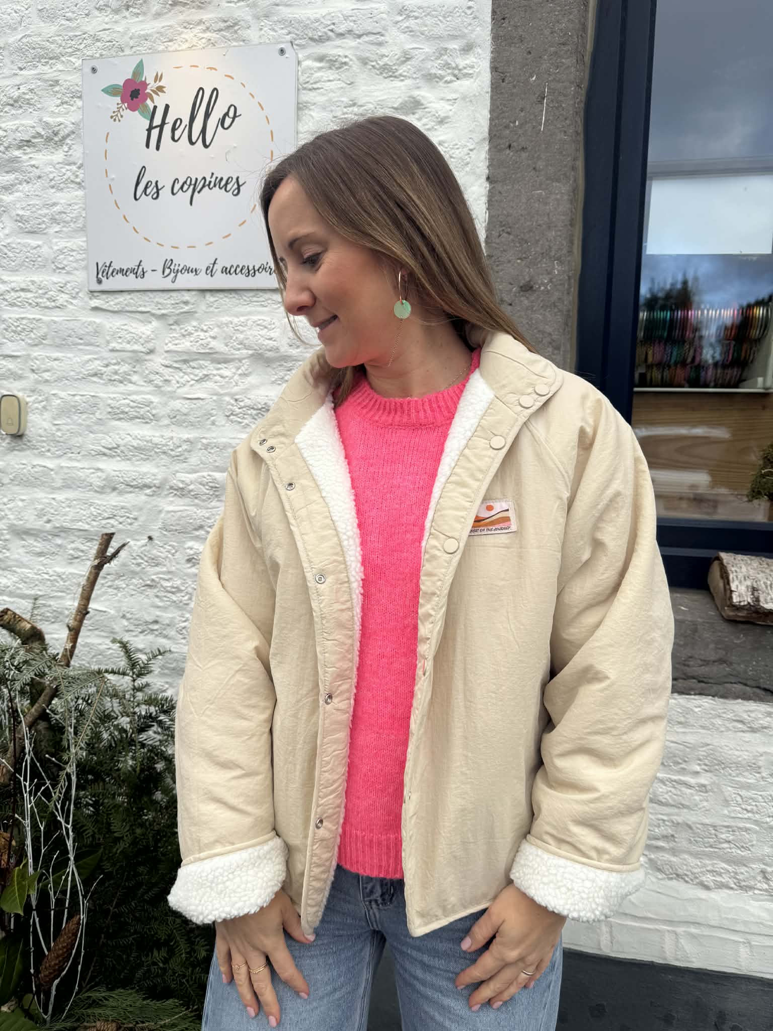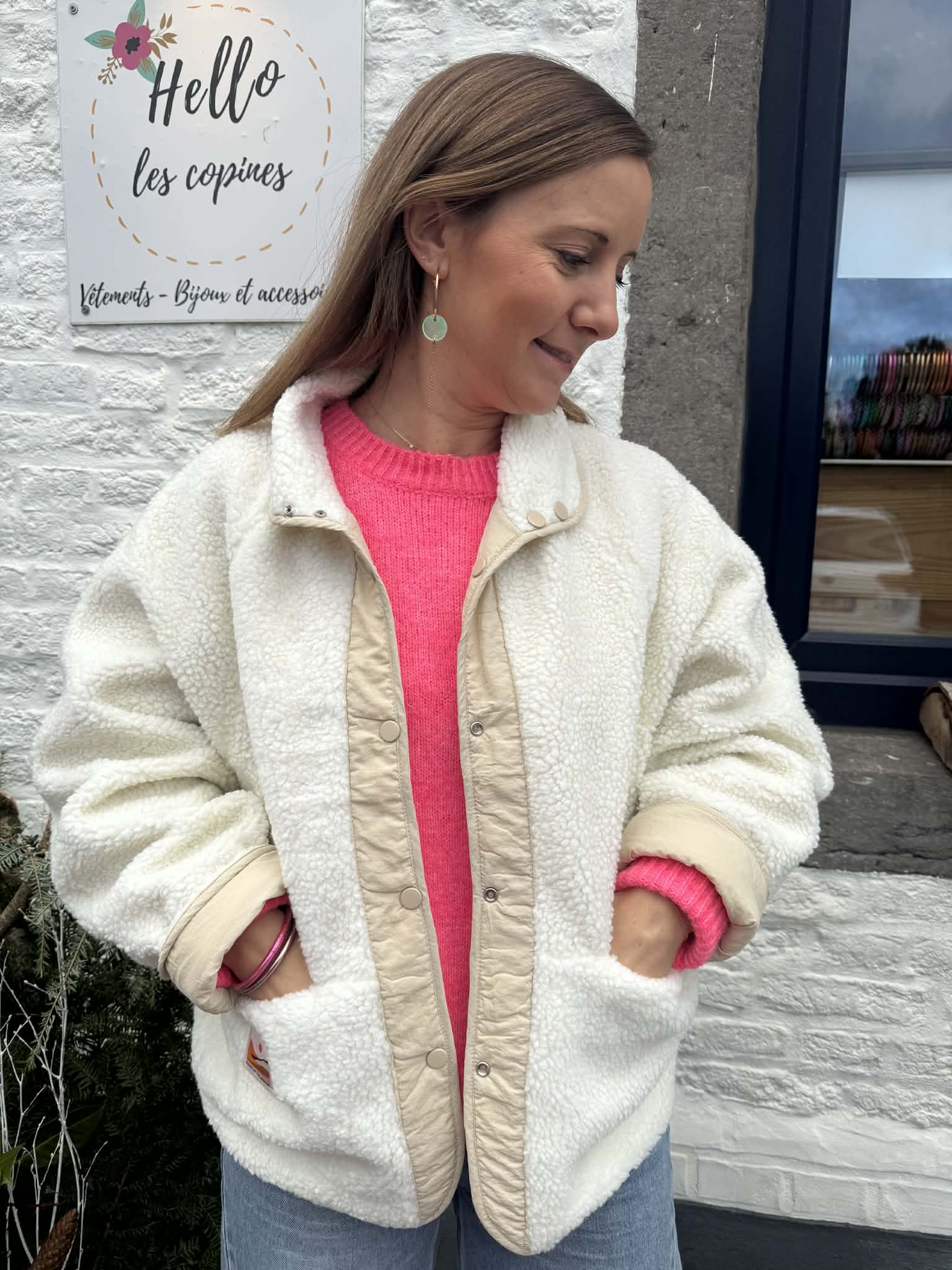 Super veste réversible, d’un côté matière mouton écru et de l’autre un tissu imperméable.