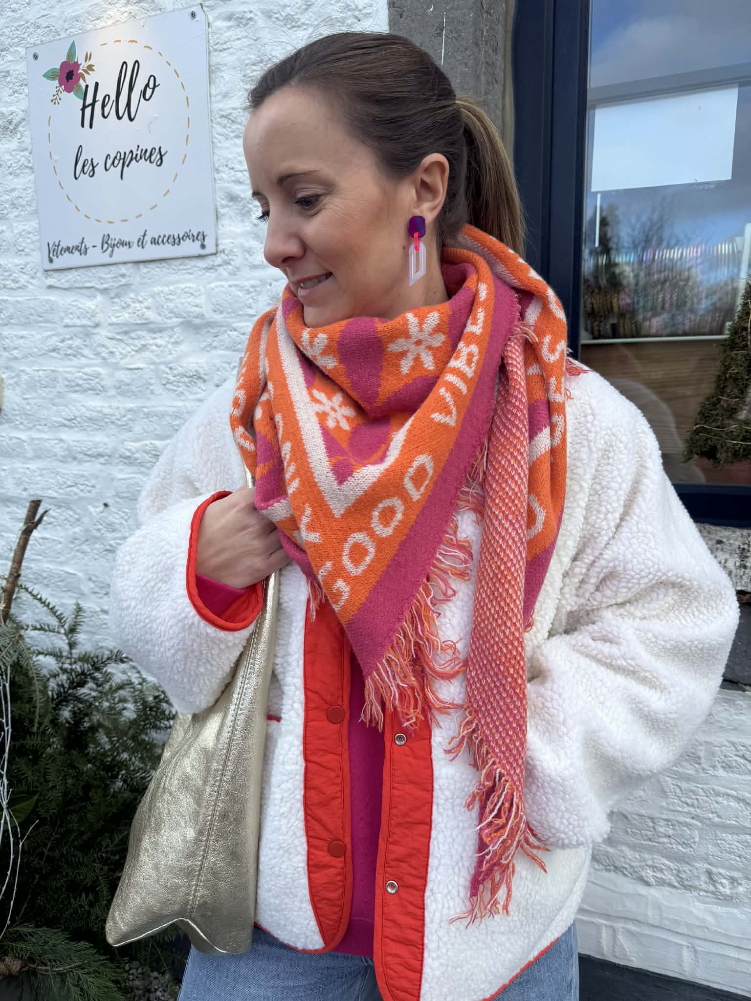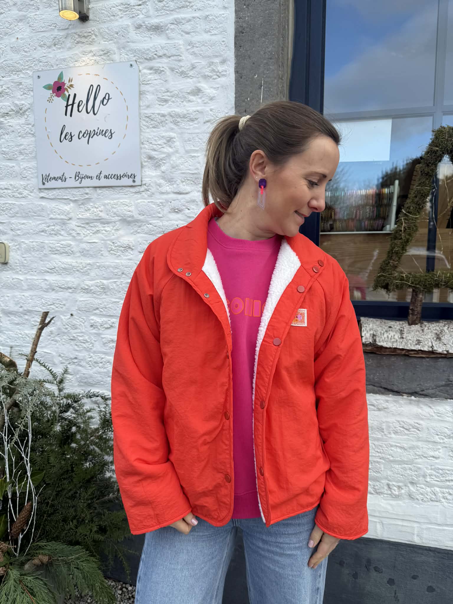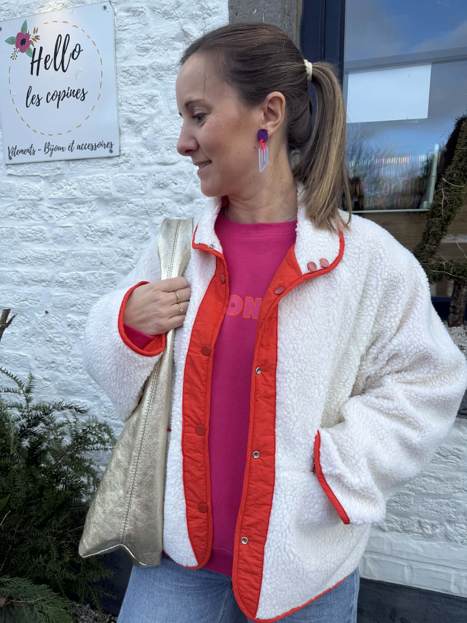 Super veste réversible, d’un côté matière mouton écru et de l’autre un tissu imperméable.